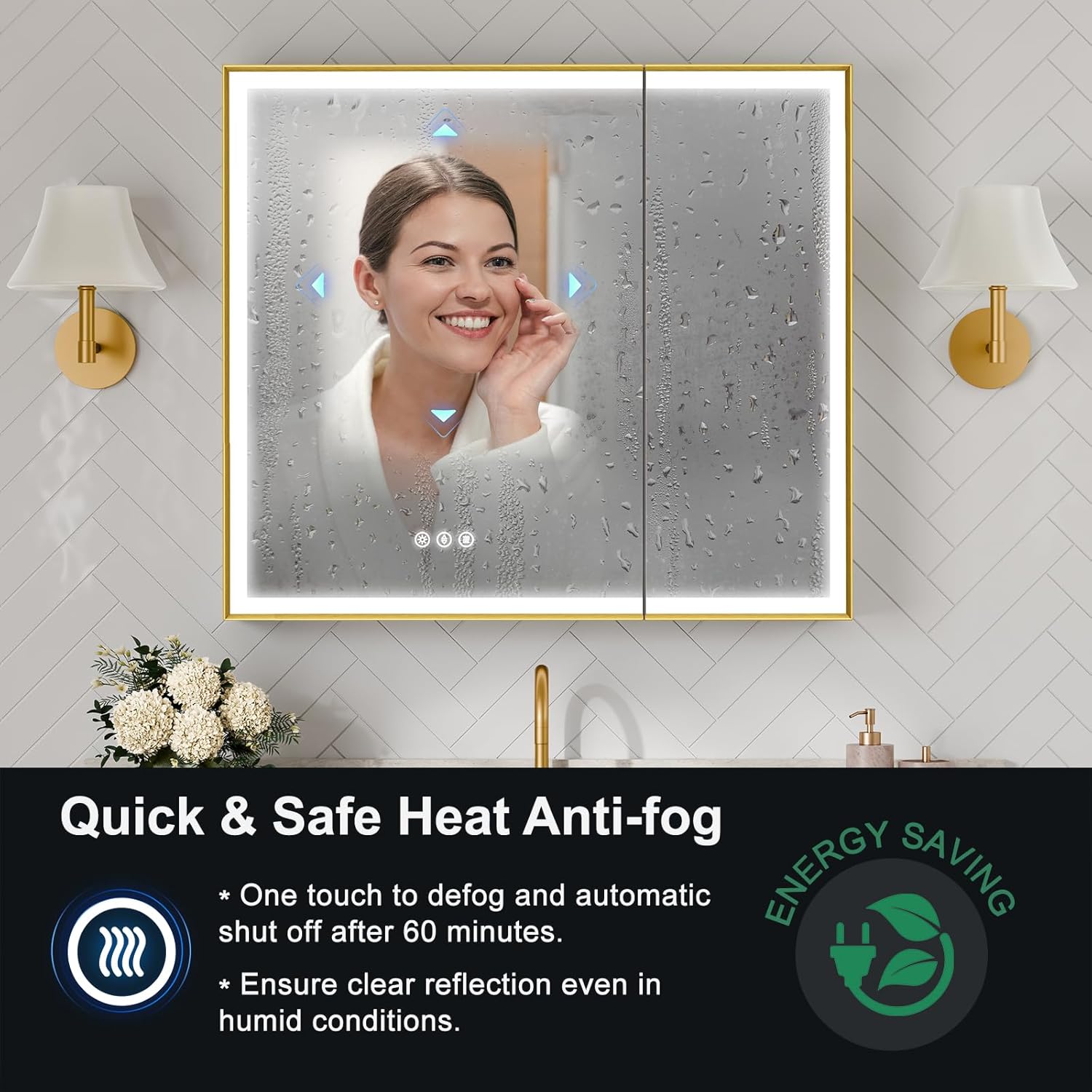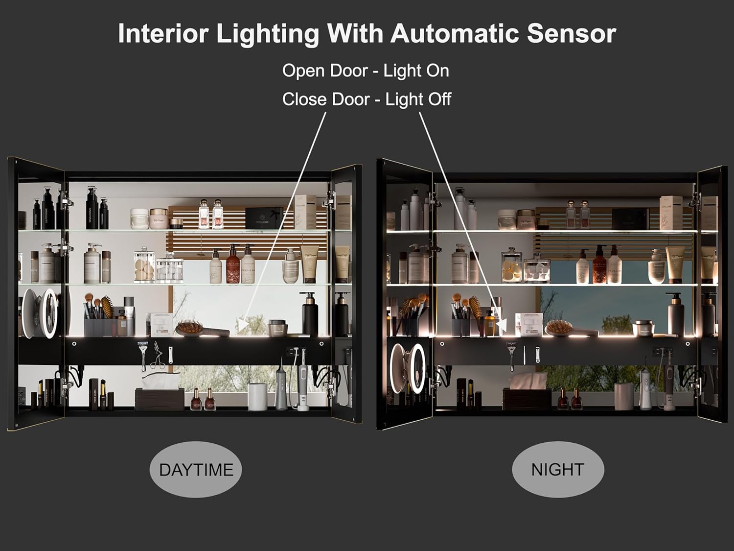 Smart Anti-Fog Technology – Built-in defogger ensures a clear mirror surface after showers. Interior Sensor Light – Automatically illuminates when the door opens and turns off when closed for effortless convenience