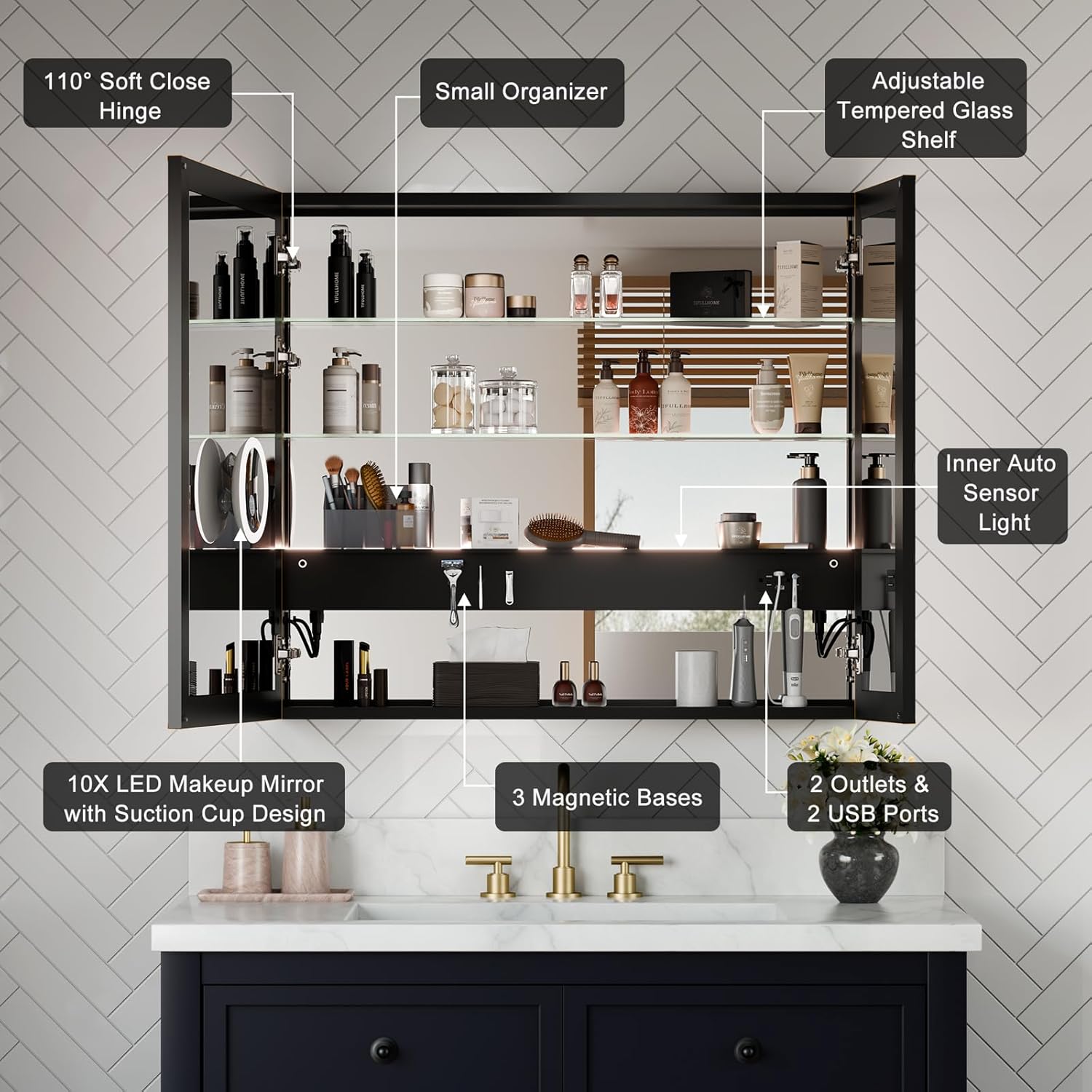 Ergonomic Centered Outlets & USB Ports – Newly designed mid-cabinet placement makes power access comfortable for users of all heights perfect for daily essentials like electric toothbrushes and shavers. Innovative Magnetic Power Zone – keeping the cabinet sleek and organized