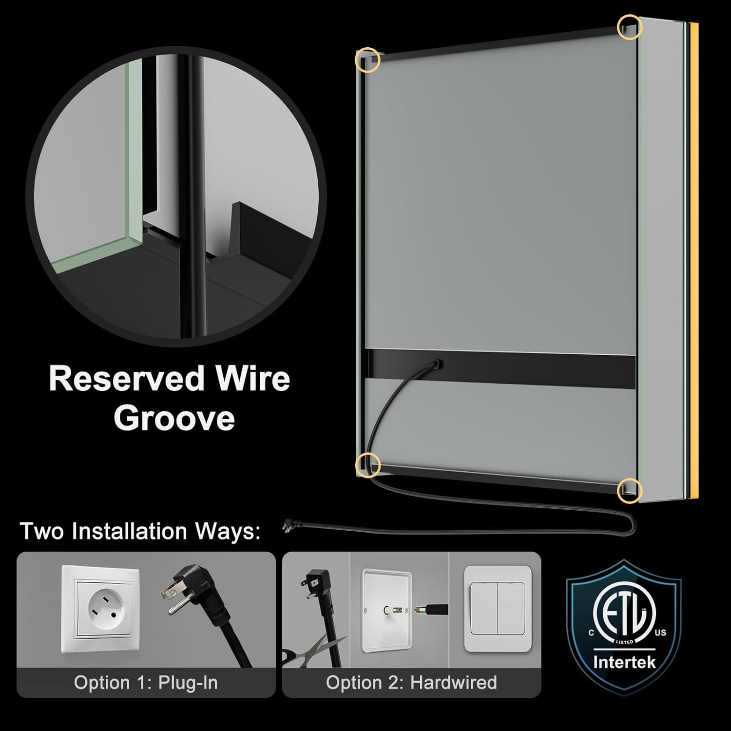 Flexible Installation Options – this led medicine cabinet mirror for bathroom can be surface-mounted or recessed adapting seamlessly to different bathroom layouts. Hkcvvual Power Options for Convenience – Supports both plug-in and hardwired connections giving you flexibility based on electrical setup