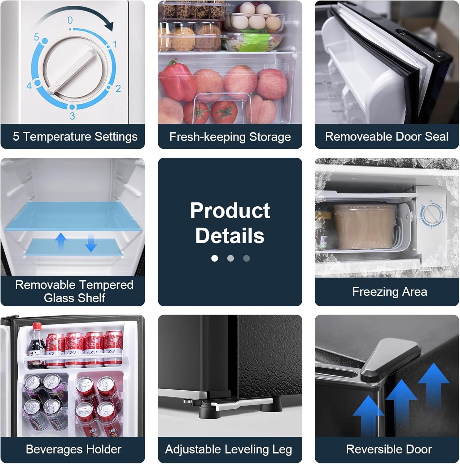 Optimized Storage & Precise Temperature ControlThis mini fridge with freezer features adjustable shelves and door bins for flexible organization. The clear temperature dial is simple to useset it to the recommended 3 for ideal conditions for most foods. The separate upright freezer compartment is best for ice making and short-term frozen storage keeping items organized and accessible.