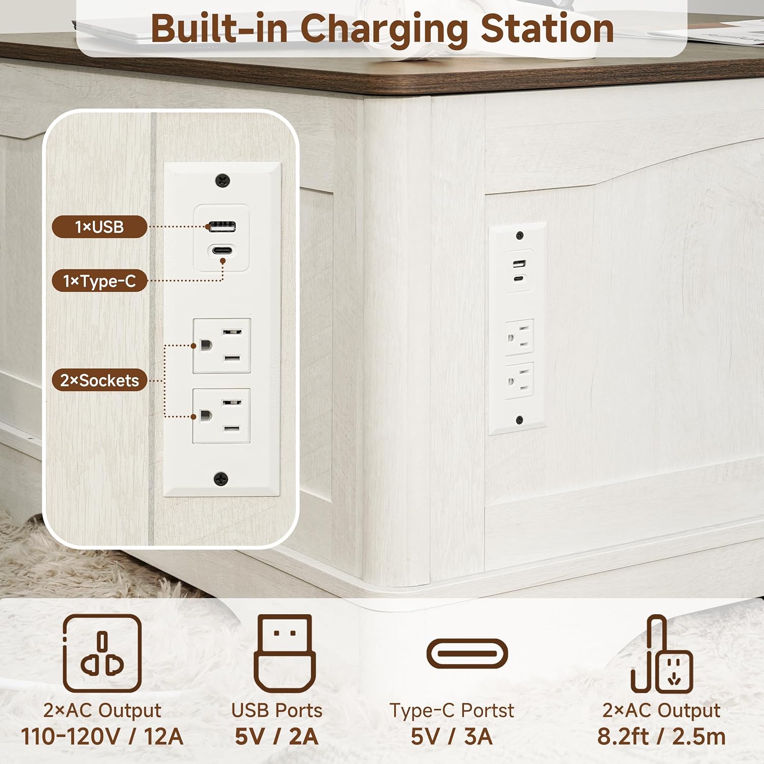 [Convenient Charging Station] Stay powered up with the built-in charging hub, including 2 AC outlets, 1 USB-C port, and 1 USB-A port. No more messy cordscharge your phone, laptop, or tablet directly from the table.