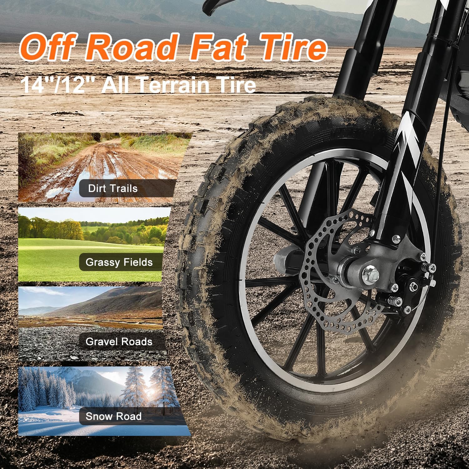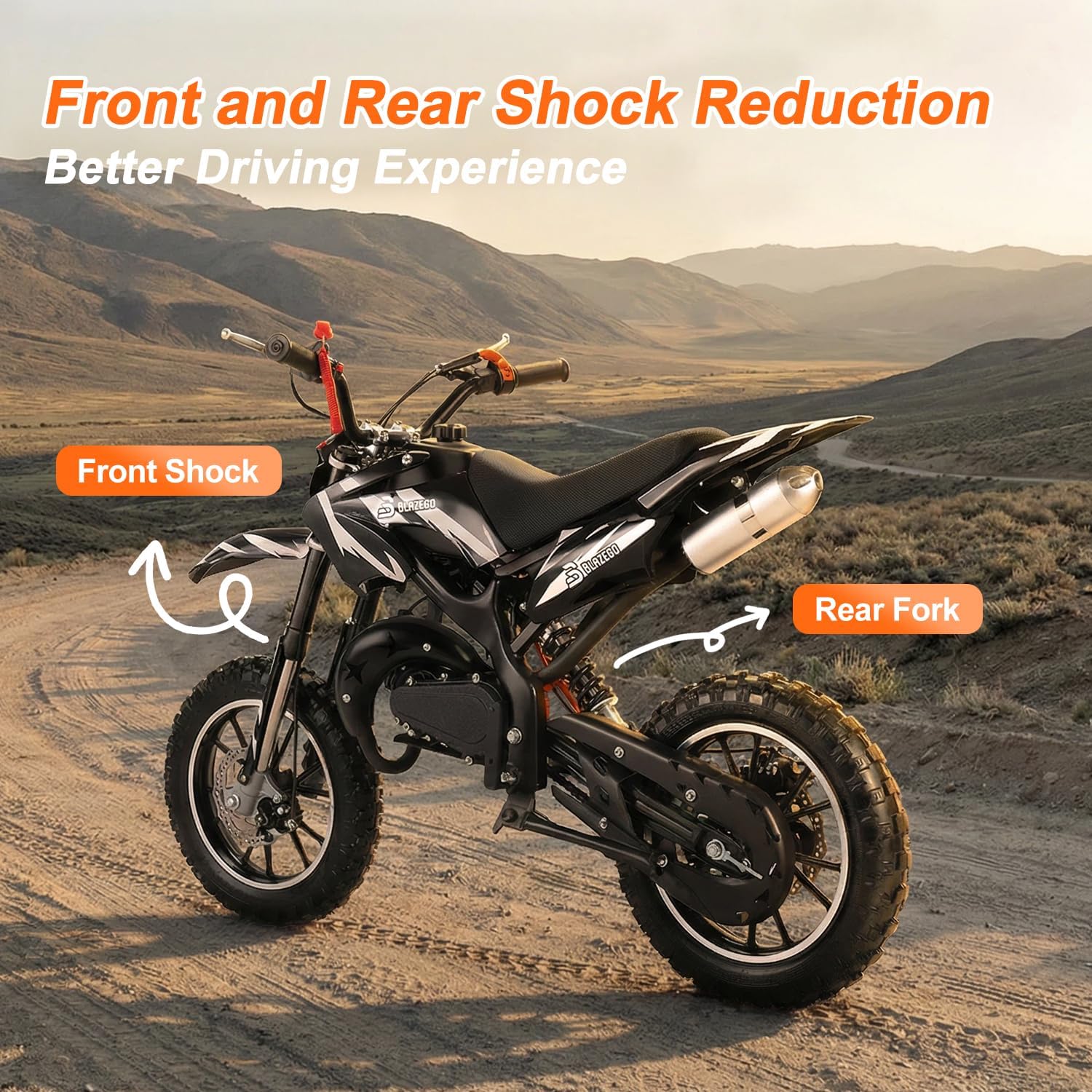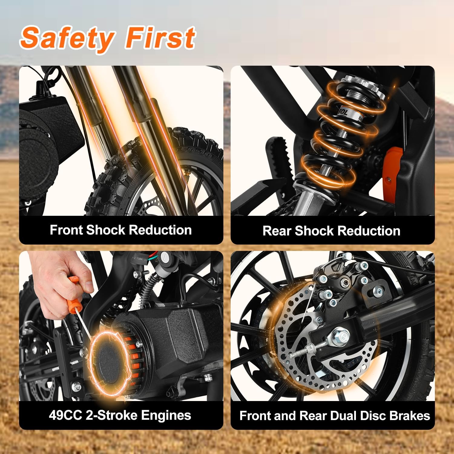 Enhanced Safety & Control: Equipped with front and rear dual disc brakes this mini bike ensures reliable stopping power. The front and rear shock reduction absorbs bumps for a smoother ride while the anti-slip 2.5-10" off-road tires provide stability on dirt grass and rough paths.