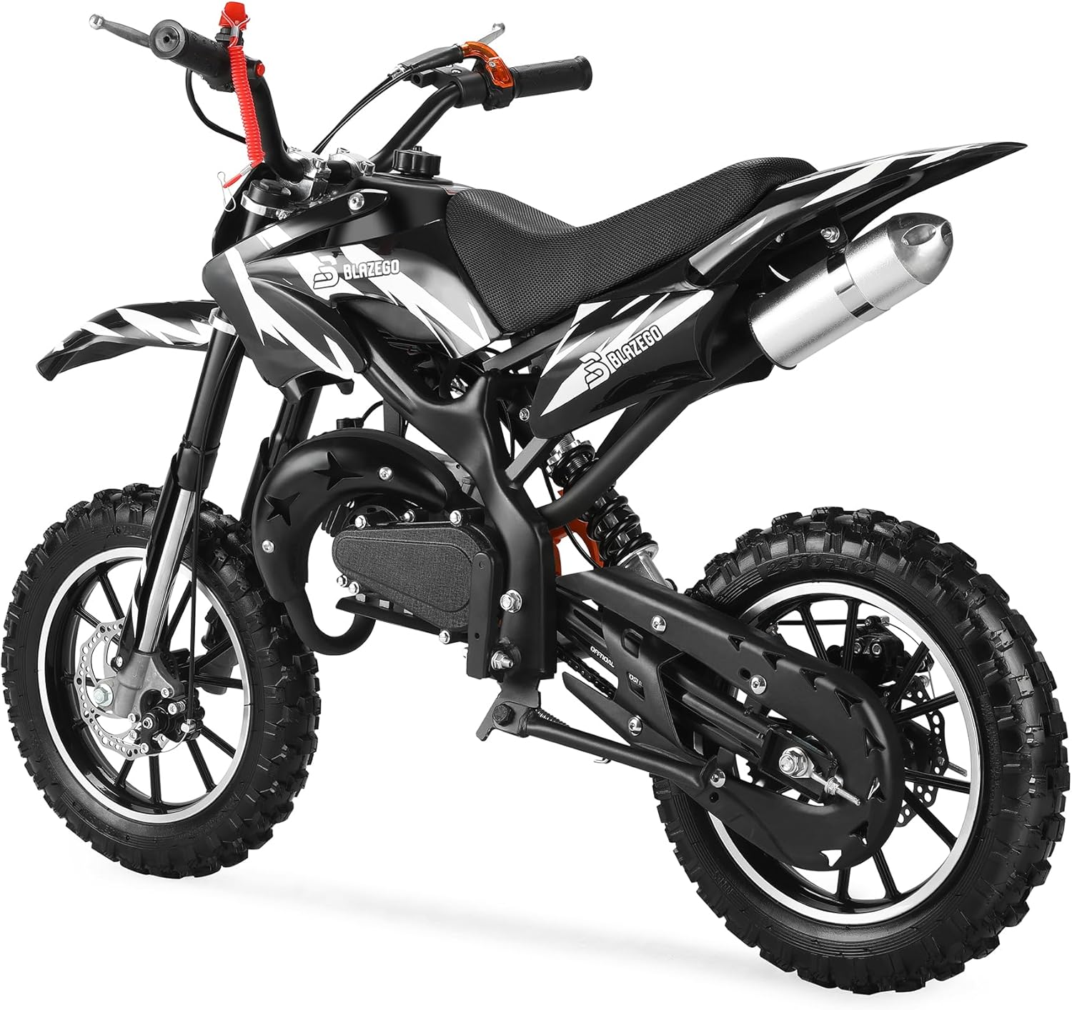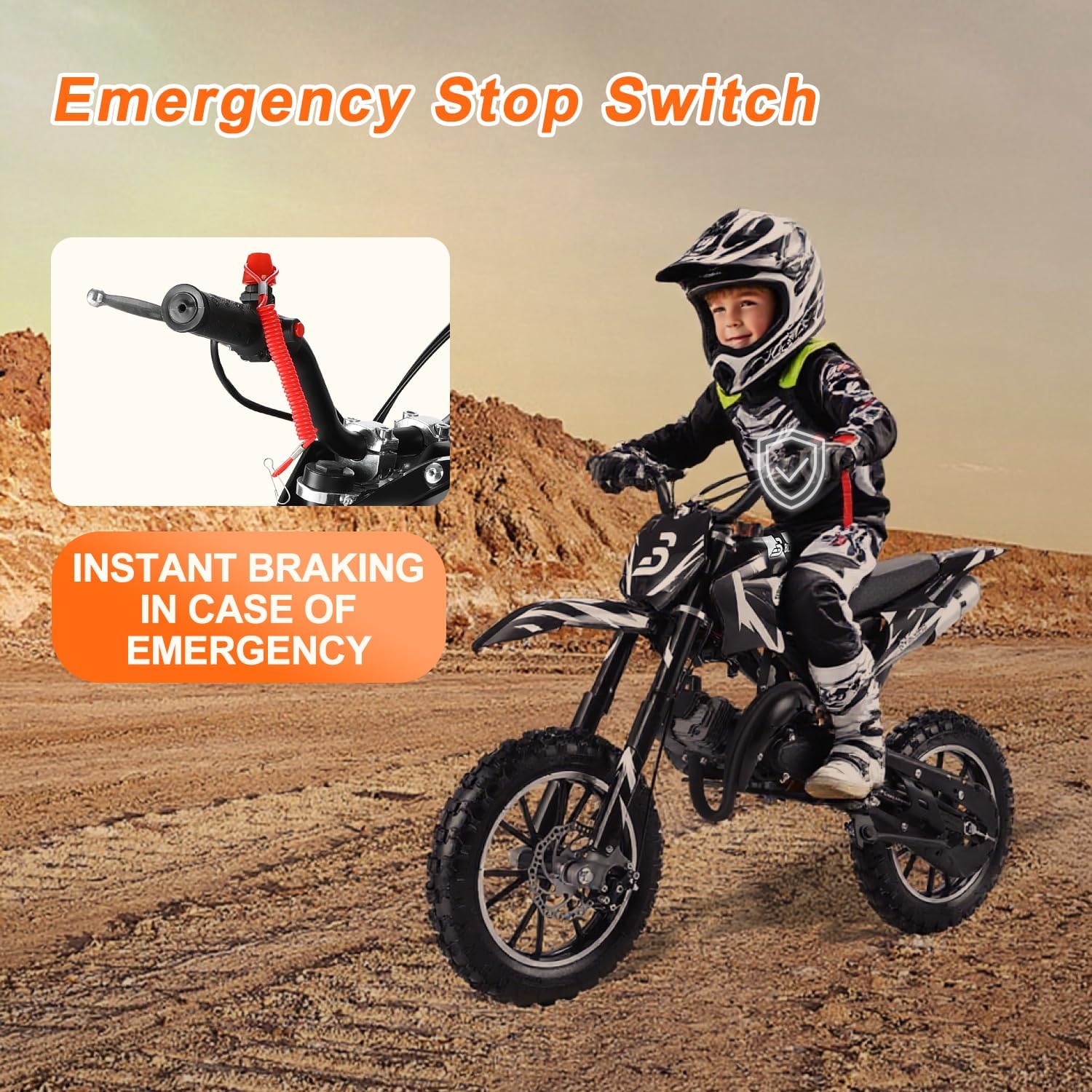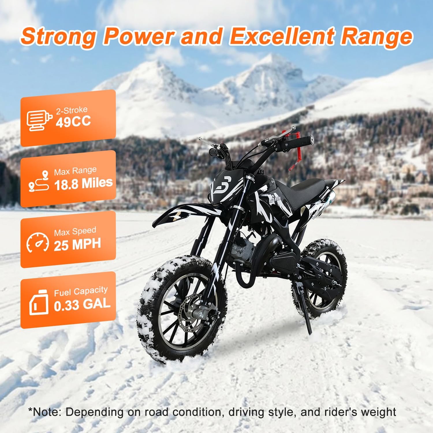 Efficient 2-Stroke Engine: Powered by a 2-stroke engine this gas dirt bike delivers strong performance while maintaining a lightweight design. With a 0.33 Gal fuel capacity and 18.8 miles max range it provides extended riding time for adventurous young riders on various terrains.
