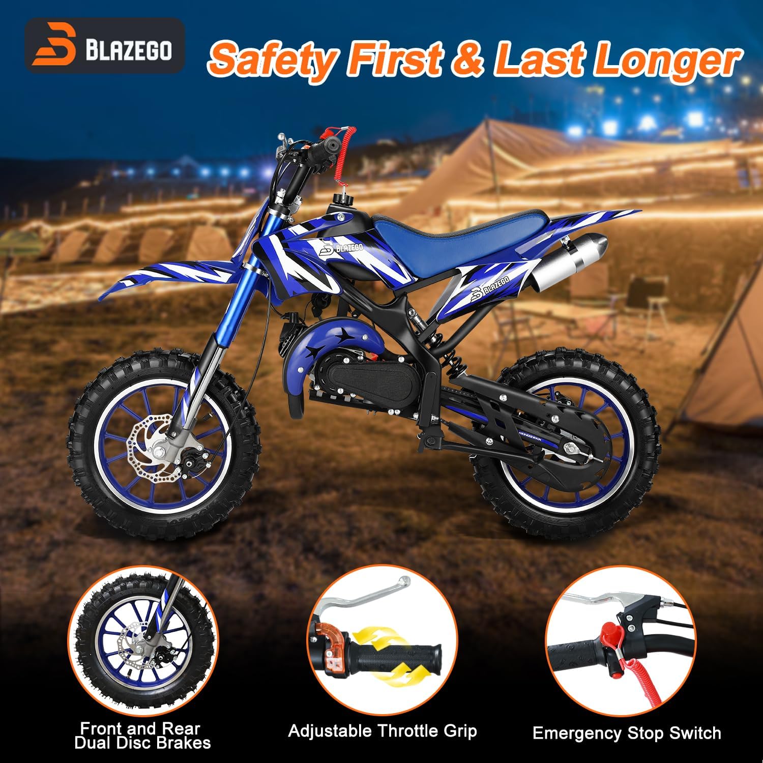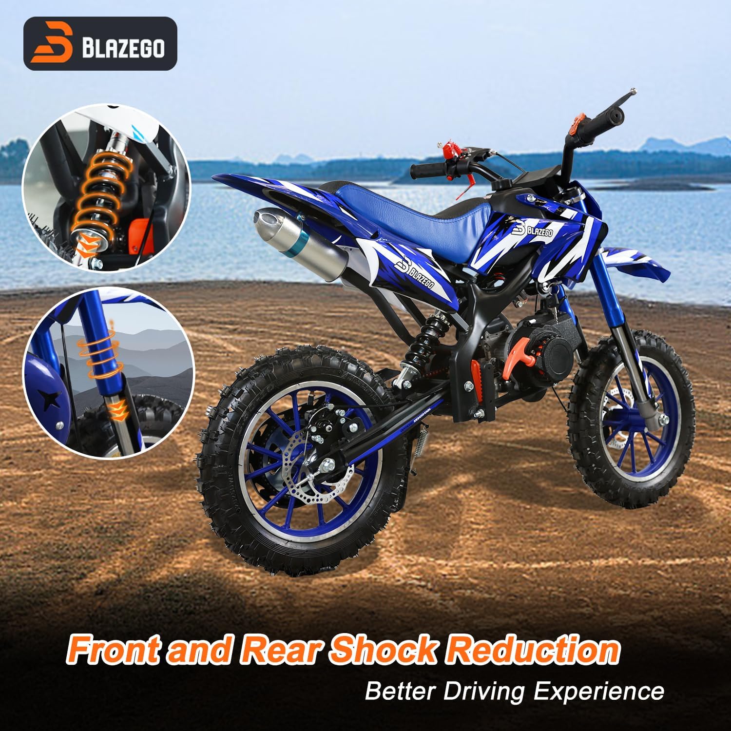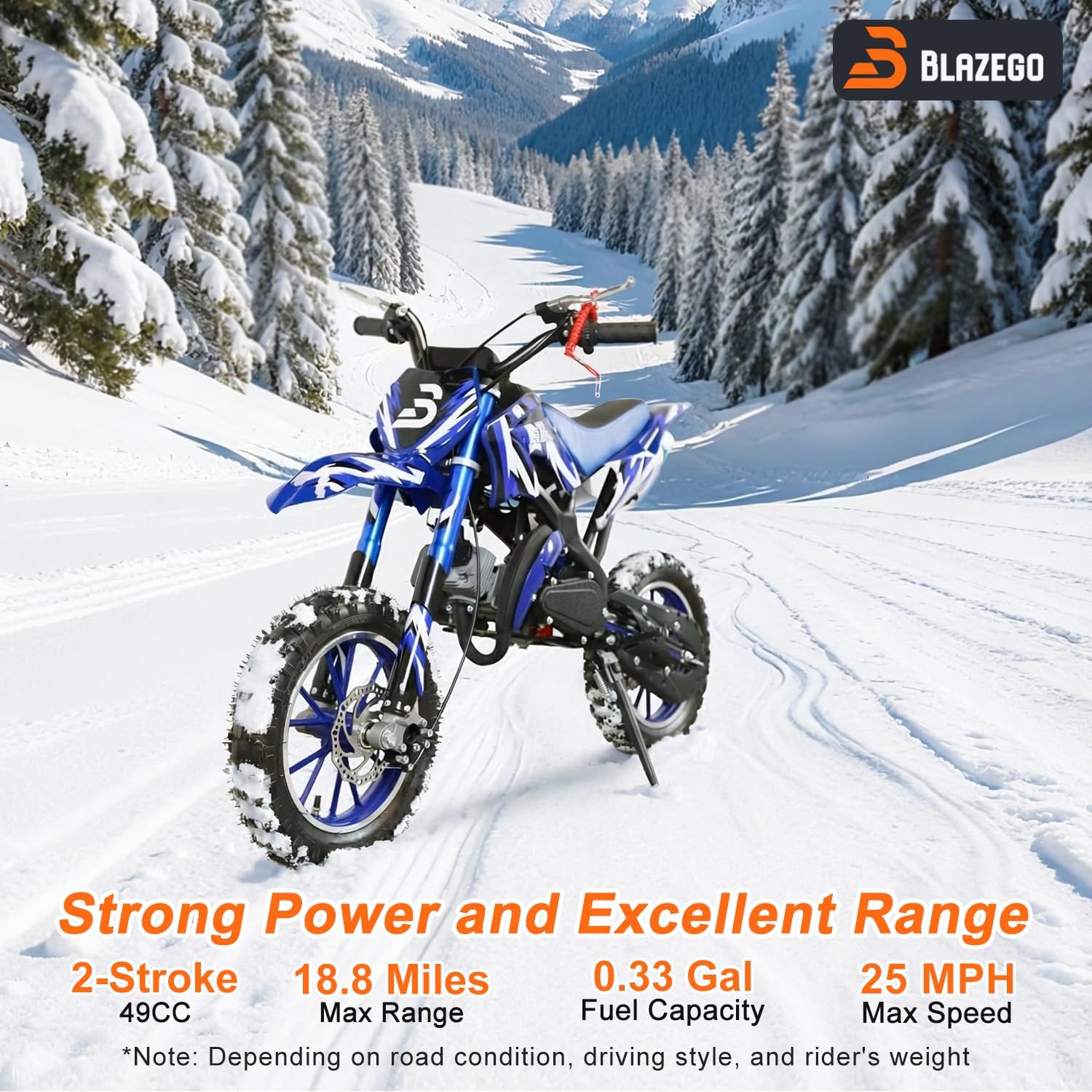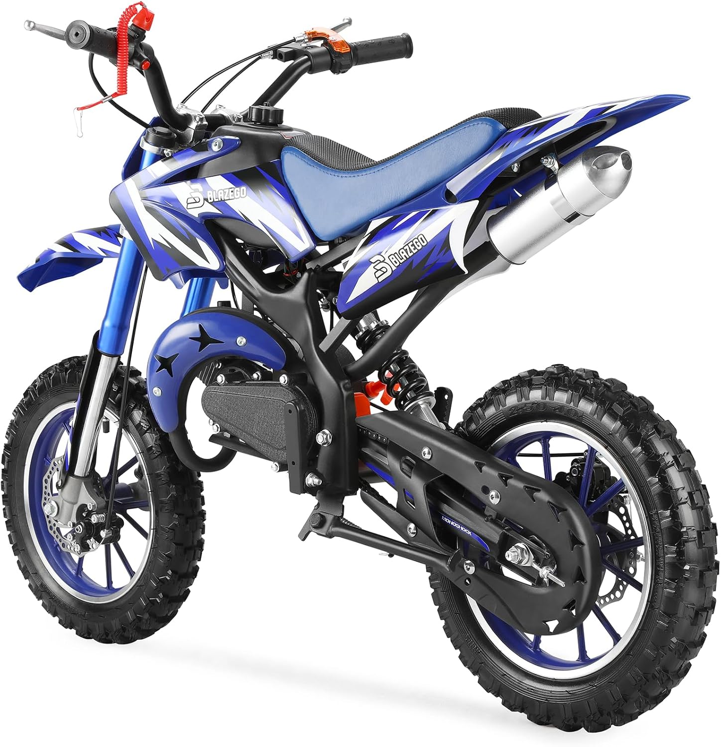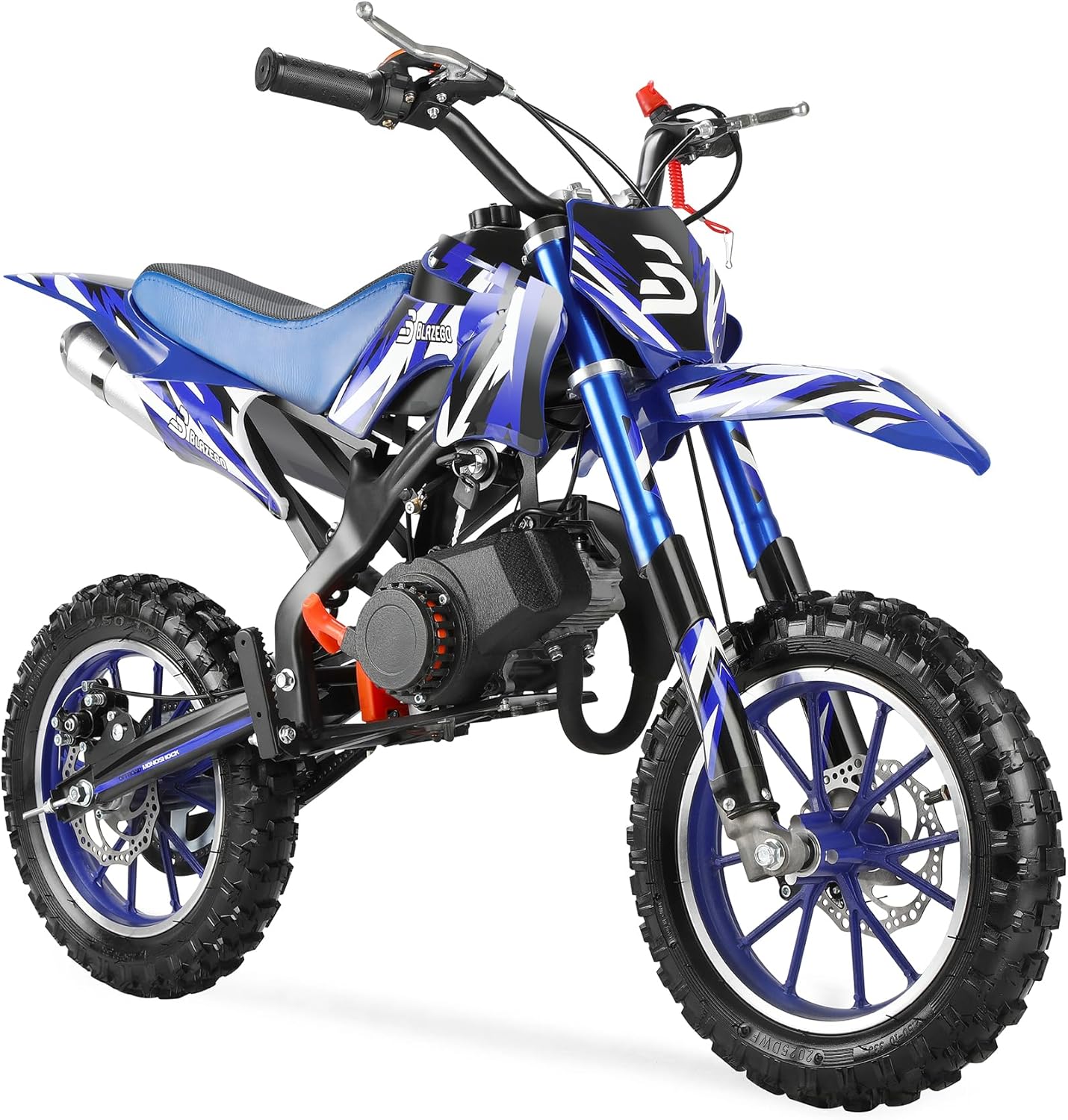 • 49CC Kids Gas Dirt Bike 2-Stroke Gas Powered Motorcycle Dual Disc Brakes Front & Rear Shock 10" Off-Road Tires 28 MPH Top Speed 132 LBS Max Load Mini Dirtbike for Kids 8-14 Blue