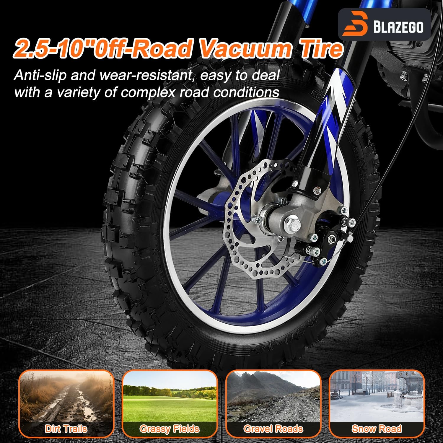 Enhanced Safety & Control: Equipped with front and rear dual disc brakes this mini bike ensures reliable stopping power. The front and rear shock reduction absorbs bumps for a smoother ride while the anti-slip 2.5-10" off-road tires provide stability on dirt grass and rough paths.