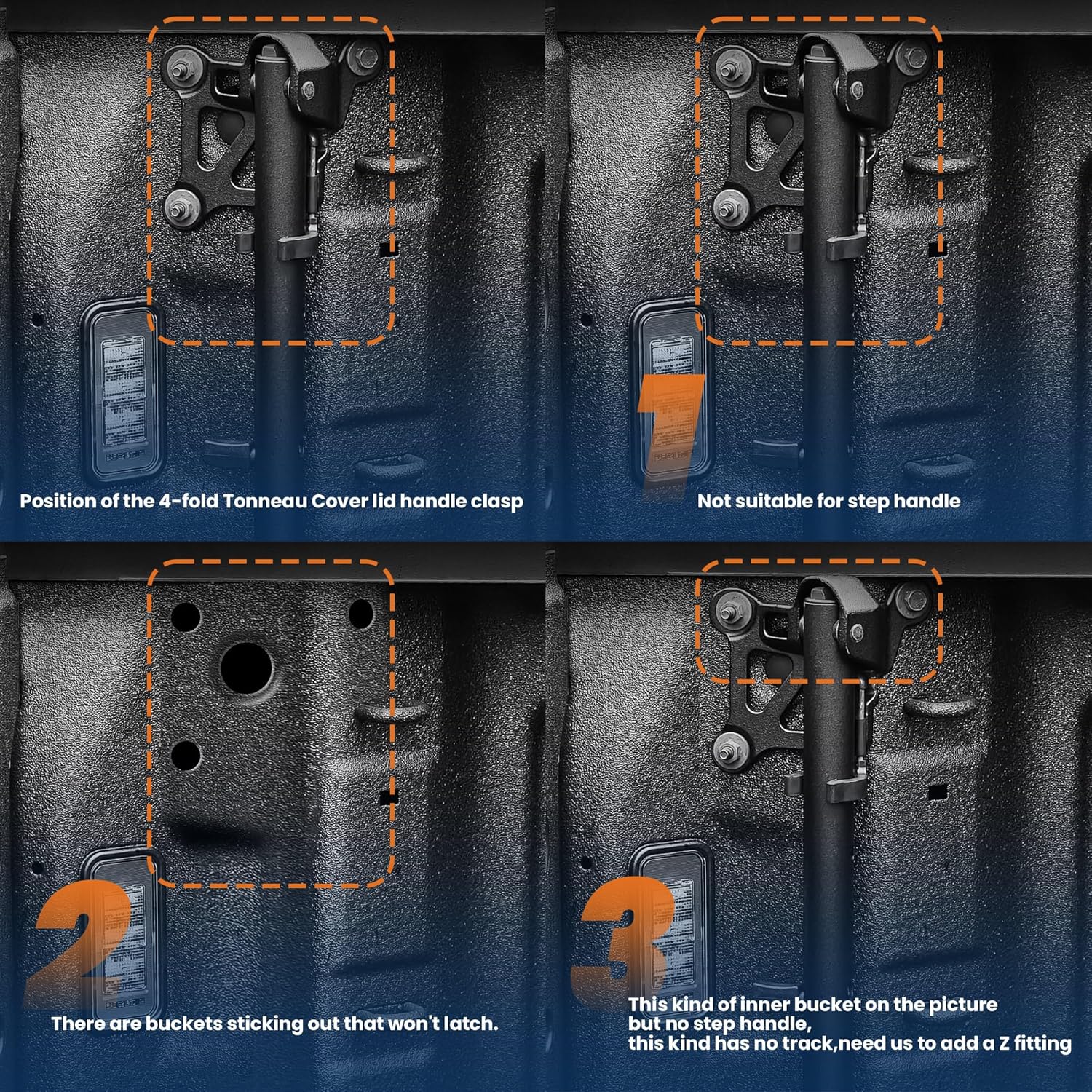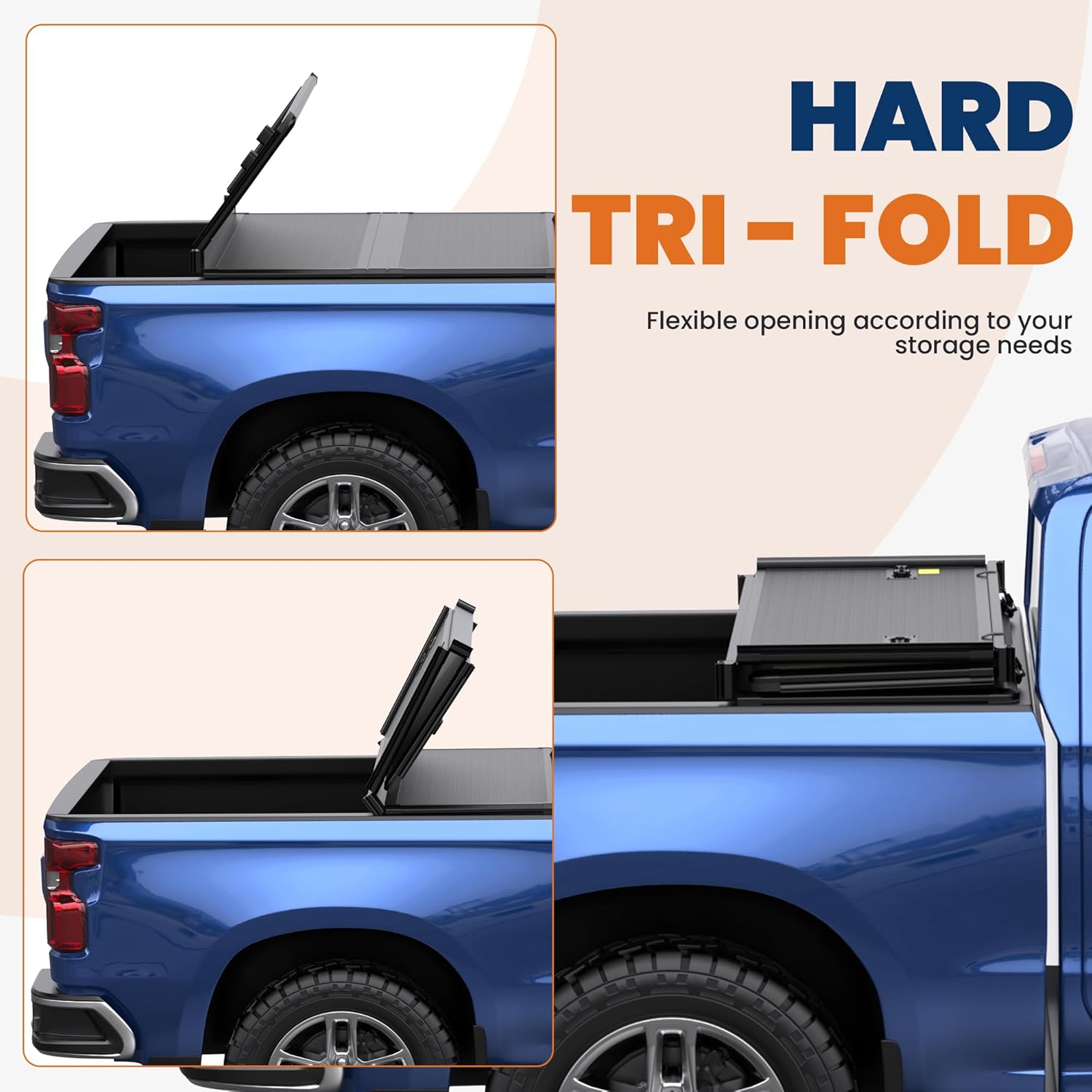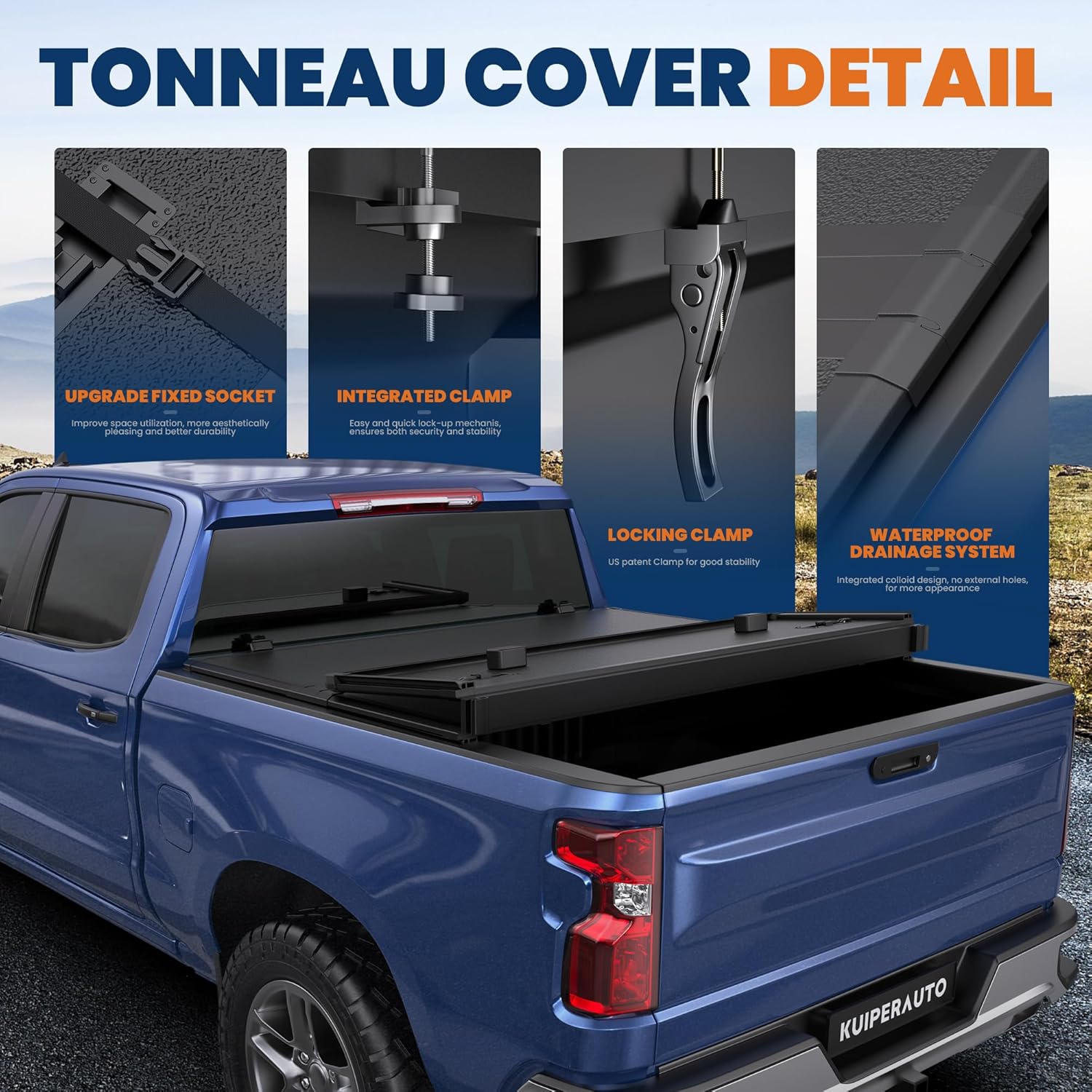 [ Innovative Design ] : The tri-flip folding low-profile bed cover is equipped with an insert-clamp design for easy adjustment and optimal fit. Its water-tight channel hinge facilitates efficient water drainage helping to maintain the cleanliness of your truck bed.