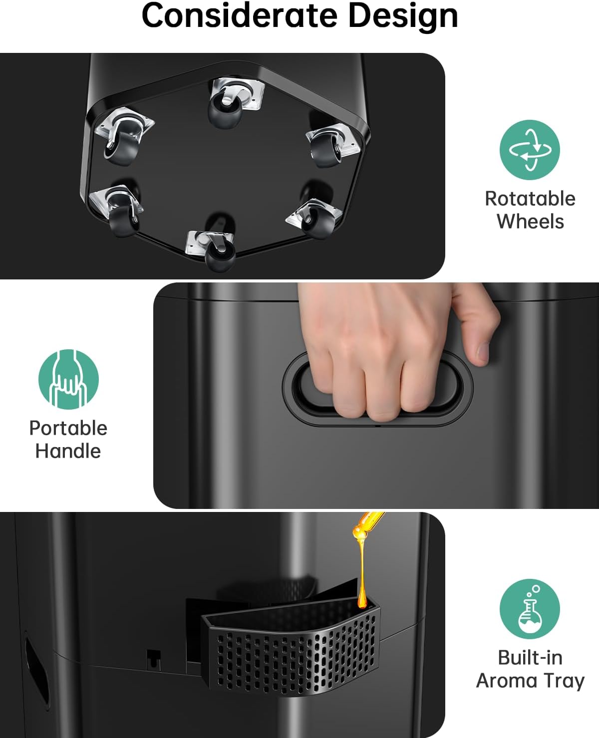 + - Forget bulky, hard-to-move humidifiers! Our sleek 6-wheel base glides effortlessly in any direction, making room-to-room movement a breeze. Enhance the ambiance with 7 calming mood light colors and use the built-in aroma tray to diffuse your favorite essential oils for a spa-like experience. (Please use the aroma tray correctly; do not add oil to the water tank).