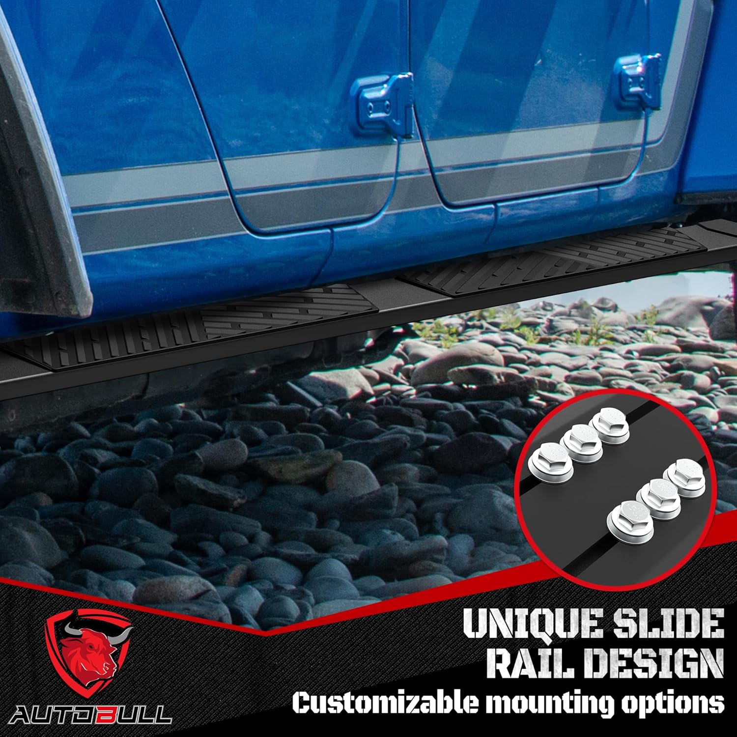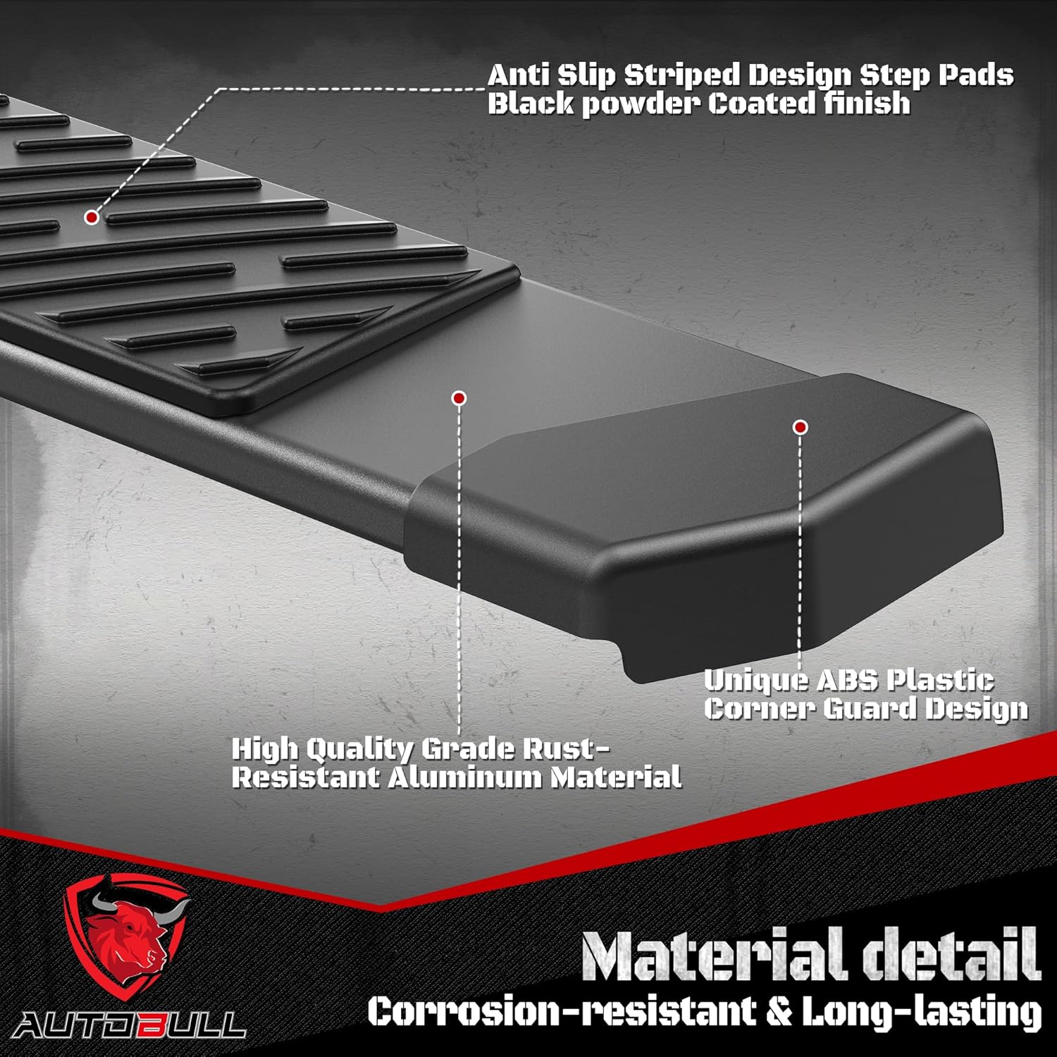 Stylish Design: Our side steps are made from high-quality rust-resistant aluminum with unique ABS plastic corner covers that protect the edges. The honeycomb anti-slip design in the center adds a stylish and modern look to your vehicle helping it stand out on the road.