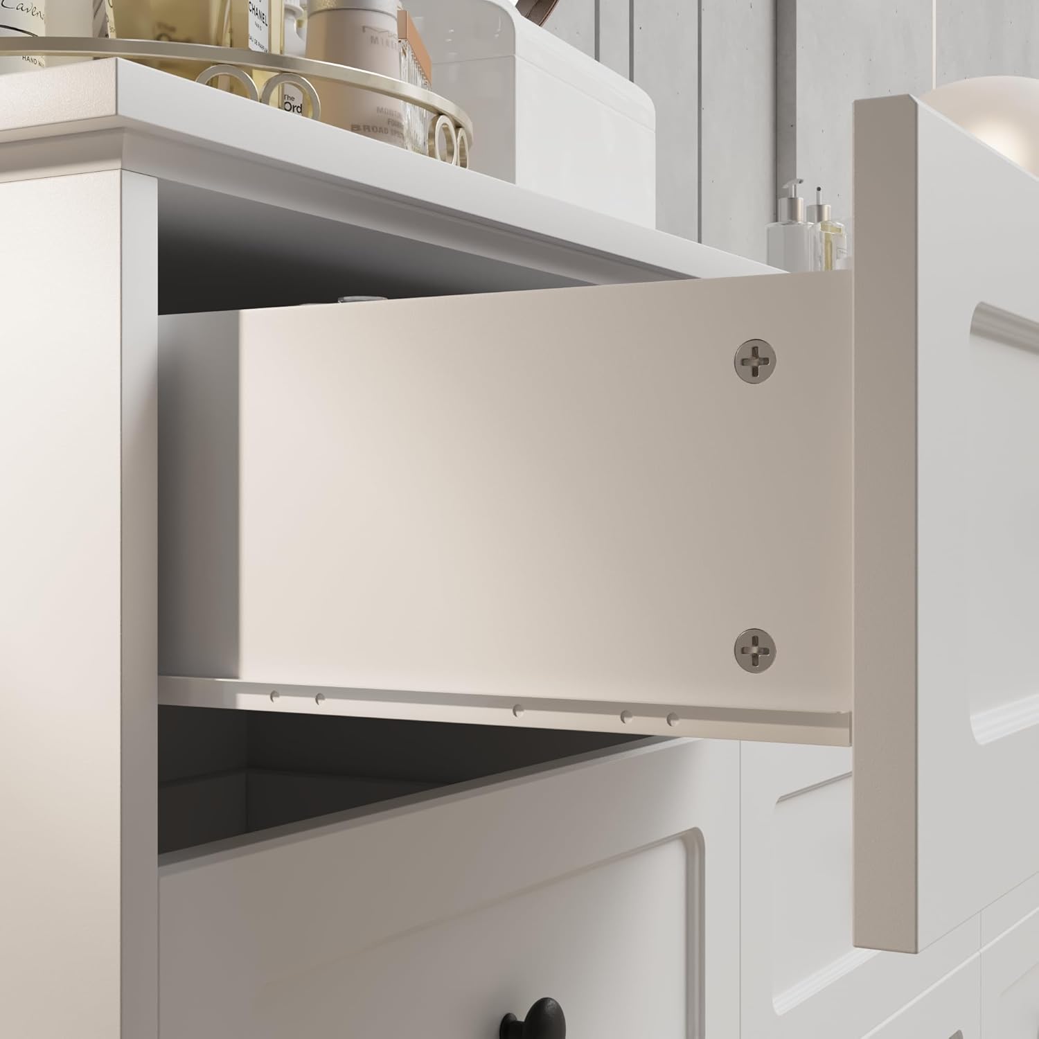 [ Stable & Durable ] Crafted from high-quality particle board, this bedroom dresser is engineered for longevity. Its robust structure ensures that it can withstand daily use without compromising stability. The smooth, waterproof surface not only makes it easy to clean but also protects the dresser from accidental spills or scratches. Each drawer is fitted with smooth gliding rails, offering reliable performance for everyday use.