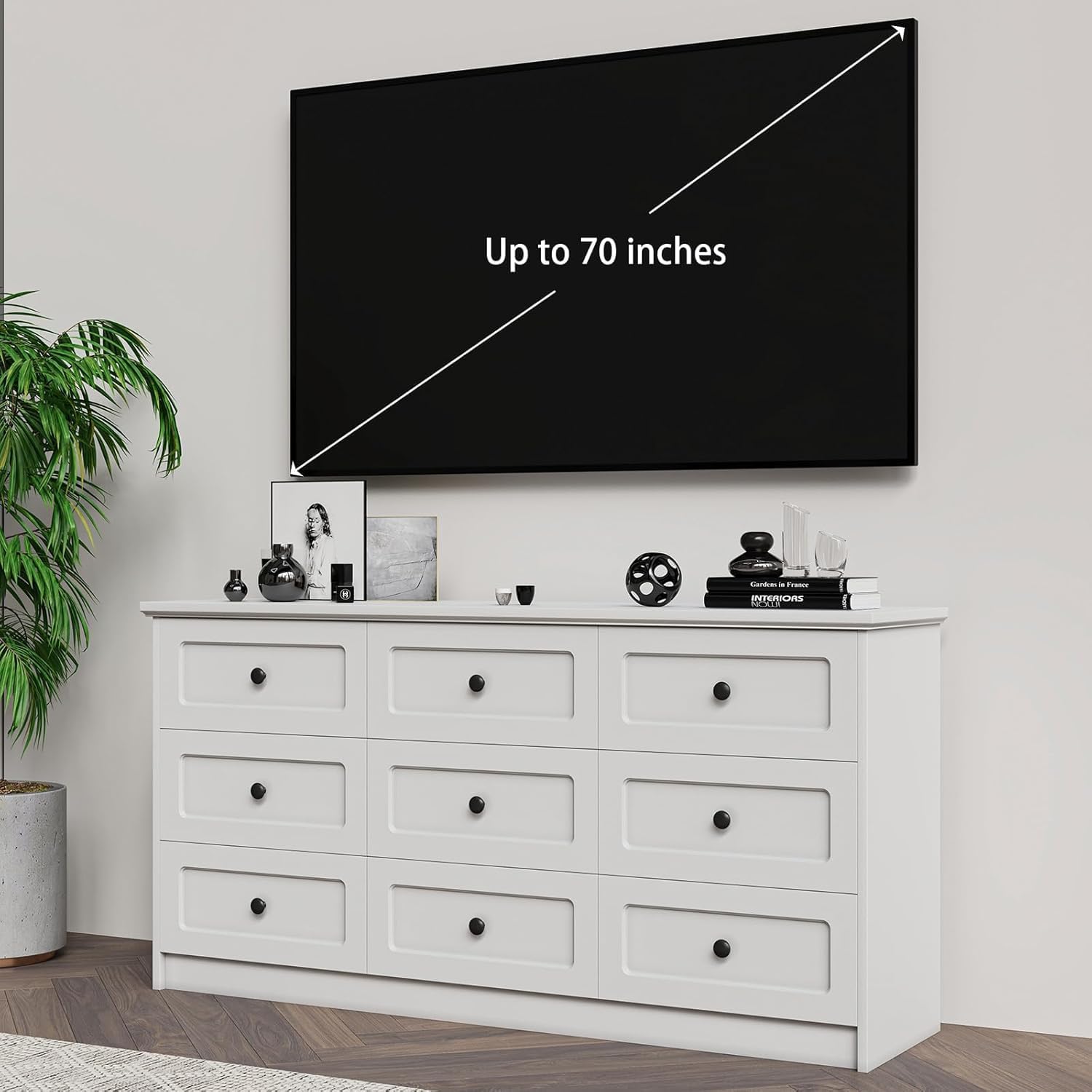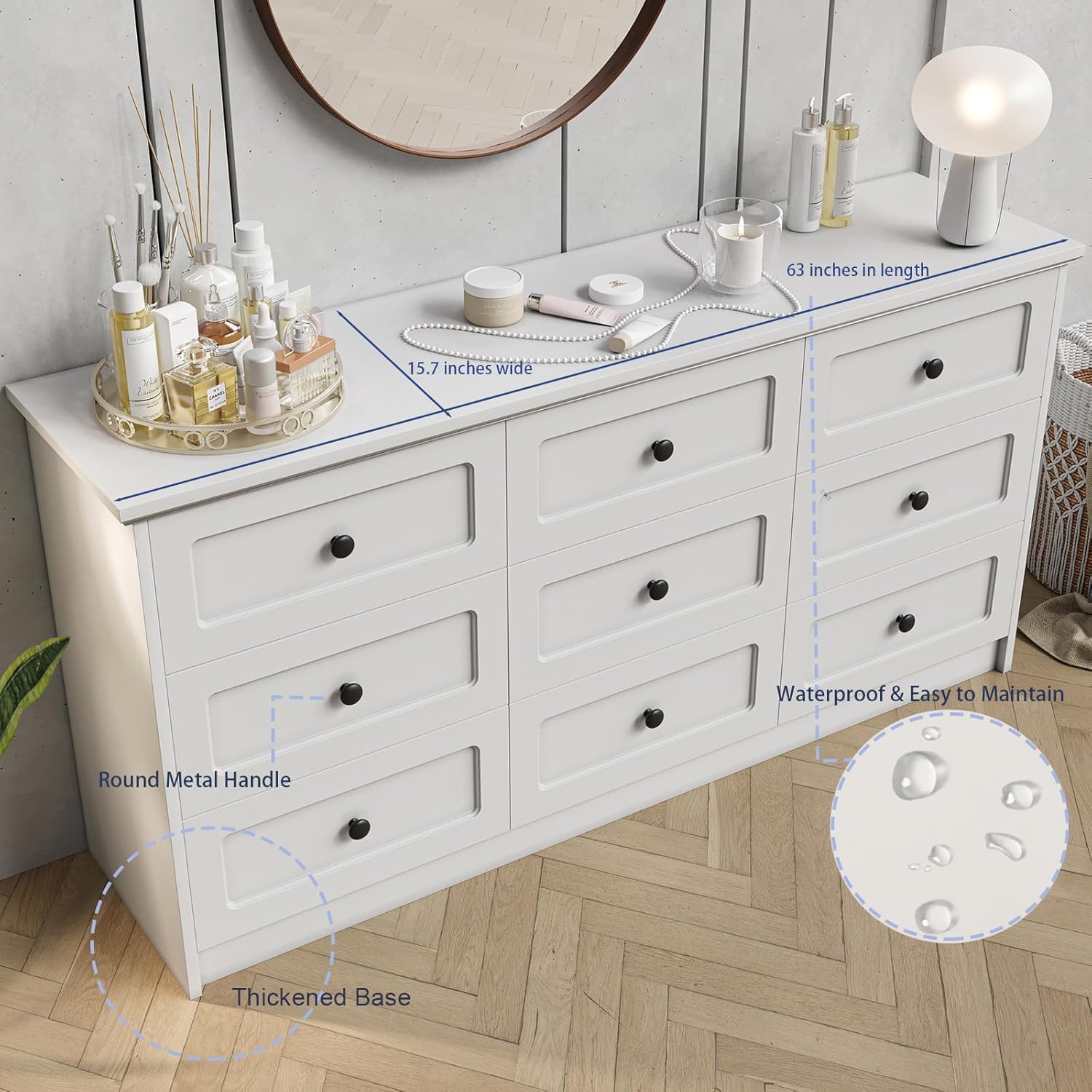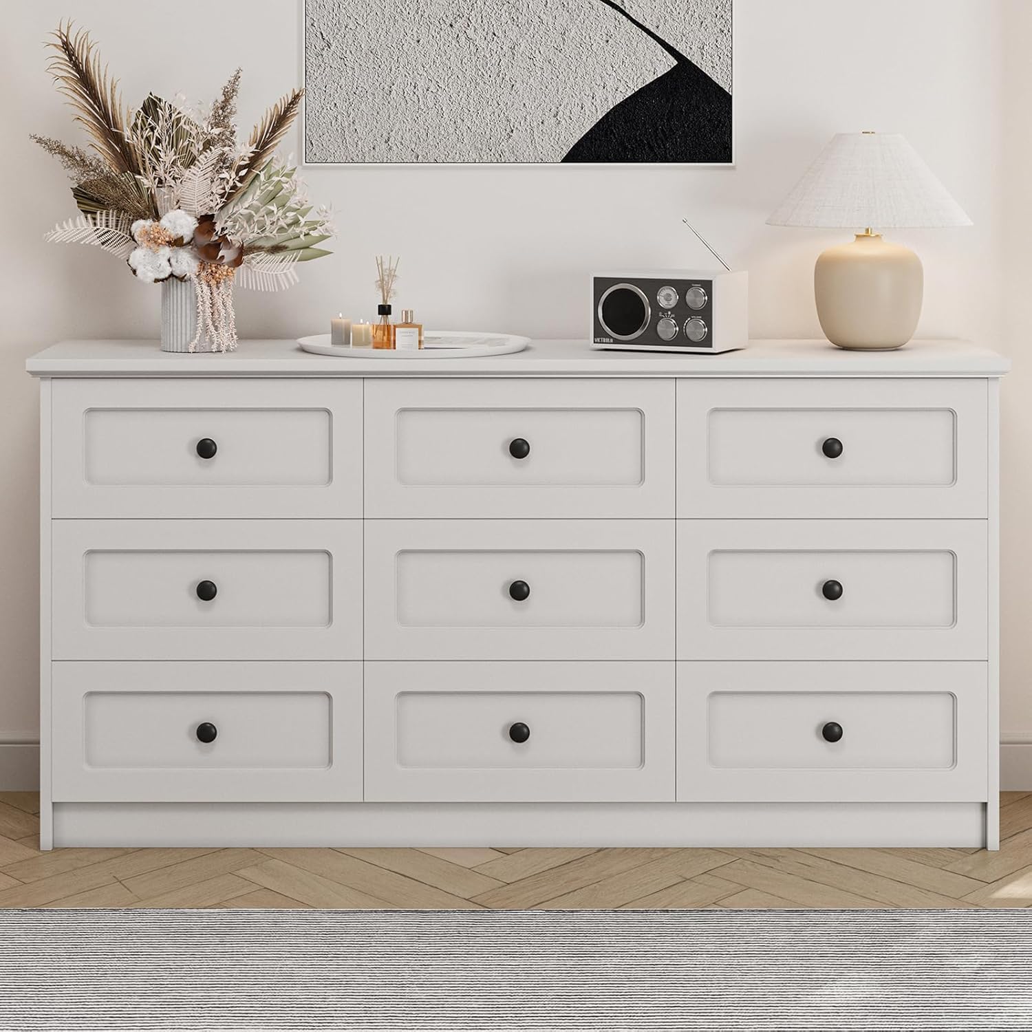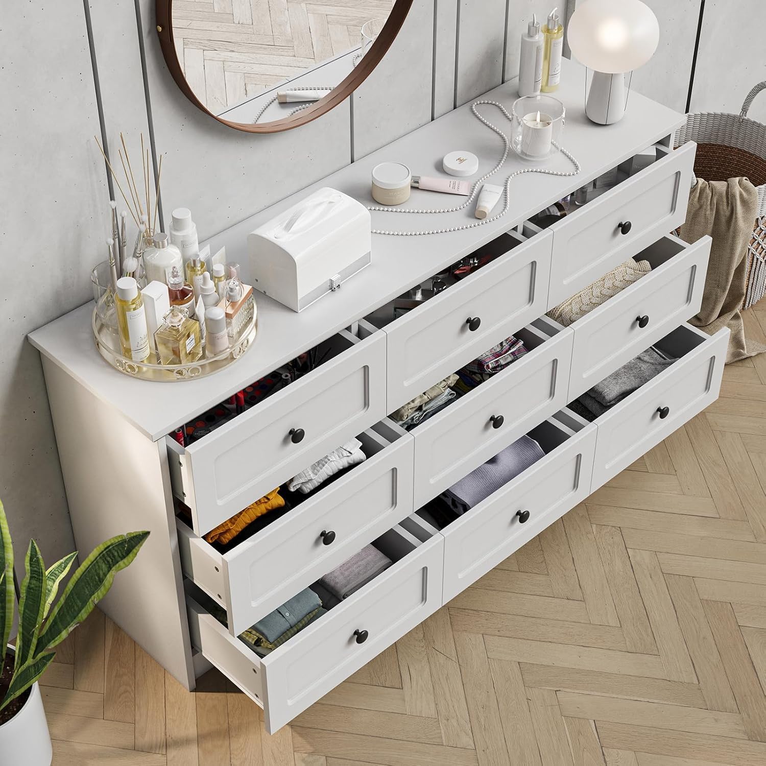 [ Multifunctional Dresser ] Designed for adaptability, this wide dresser can serve various purposes throughout your home. Place it in your bedroom to organize clothes and bedding, or position it in the living room or hallway as a stylish console table. Its sleek design also makes it a practical storage solution for walk-in closets, offering plenty of drawer space to store seasonal clothing or accessories.