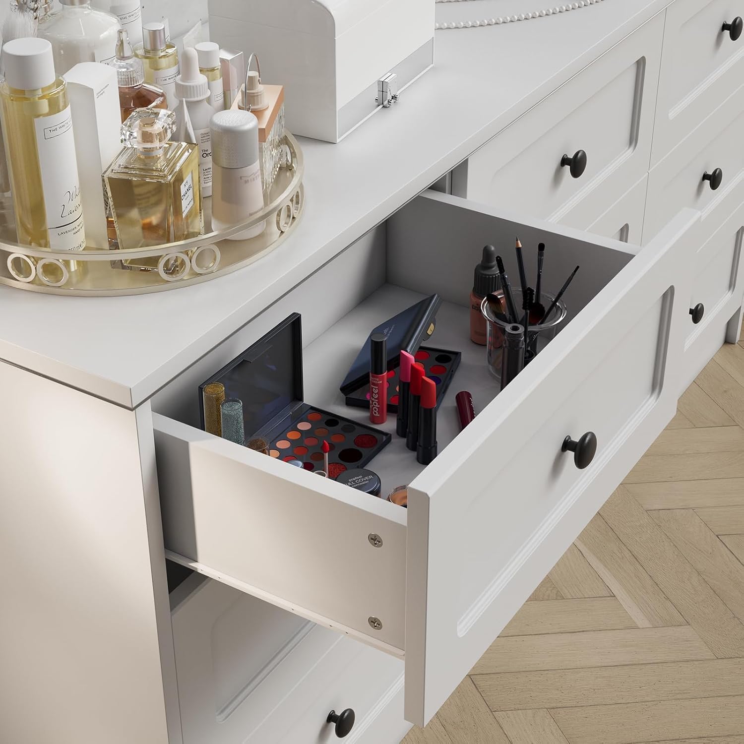 [ Elegant & Practical Design ] Designed with elegance and practicality, our legless standing dresser features soft-close drawers and 3D press-frame drawer fronts with black handles. Its classic color scheme effortlessly complements any decor. The smooth metal glides ensure hassle-free drawer opening and closing.