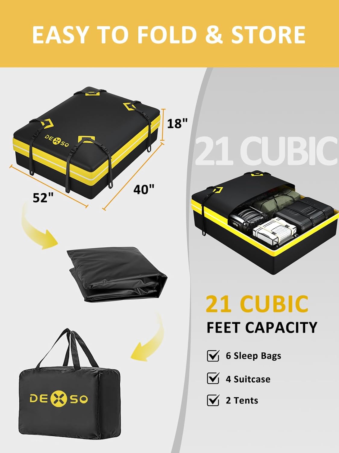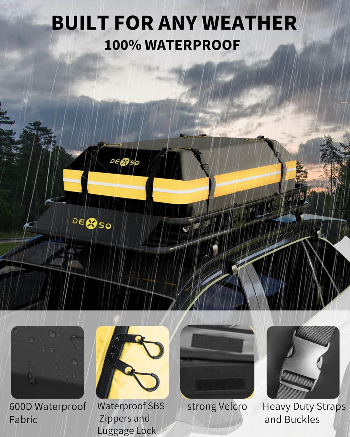 WATERPROOF & DURABLEThe universal roof racks are coated with matte black powder that resists the elements rust and scratches. The soft-shell luggage bag is constructed with multi-layer reinforcement at the seams for wear resistance providing strong waterproof and UV performance as well as the ability to withstand adverse weather conditions such as wind rain and snow ensuring long-lasting durability