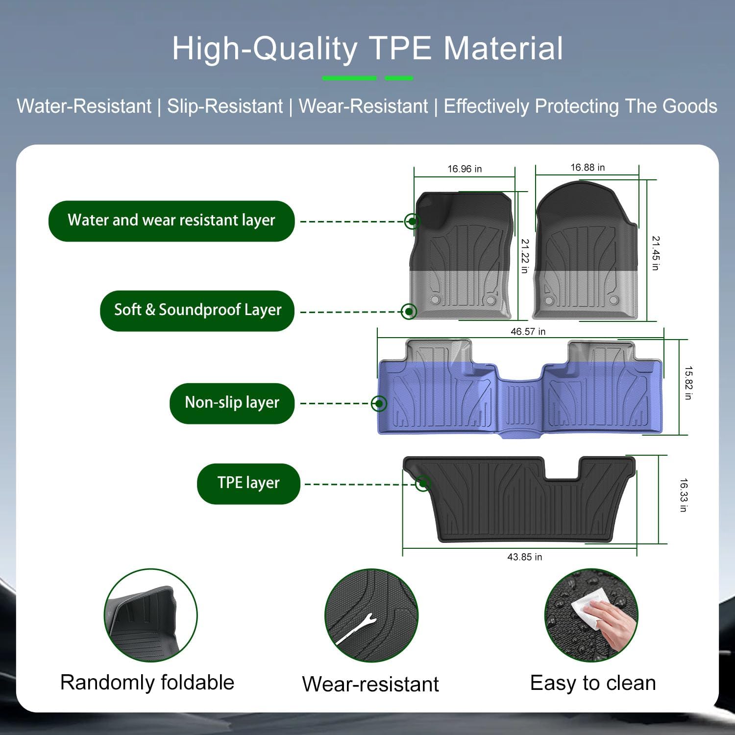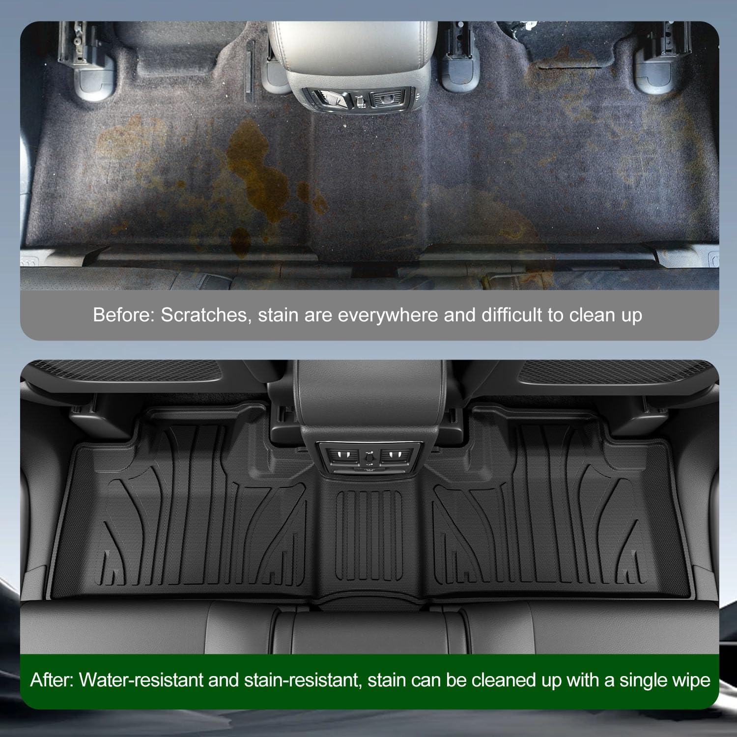 Multiple Function:The cargo mats protect your third-row seat back and trunk and offers practical protection against dirt mud and pet hair.They also change the appearance of your vehicle.The mat can keep your cars interior clean and tidy. the floor mats provide protection for your vehicle's flooring.The rice grain pattern enhances friction and keeps seat back from scratches.This mat is easy to clean just wipe with a damp rag or rinse with water.