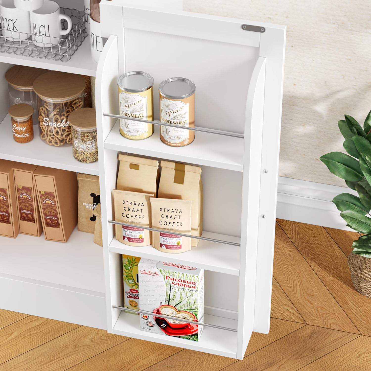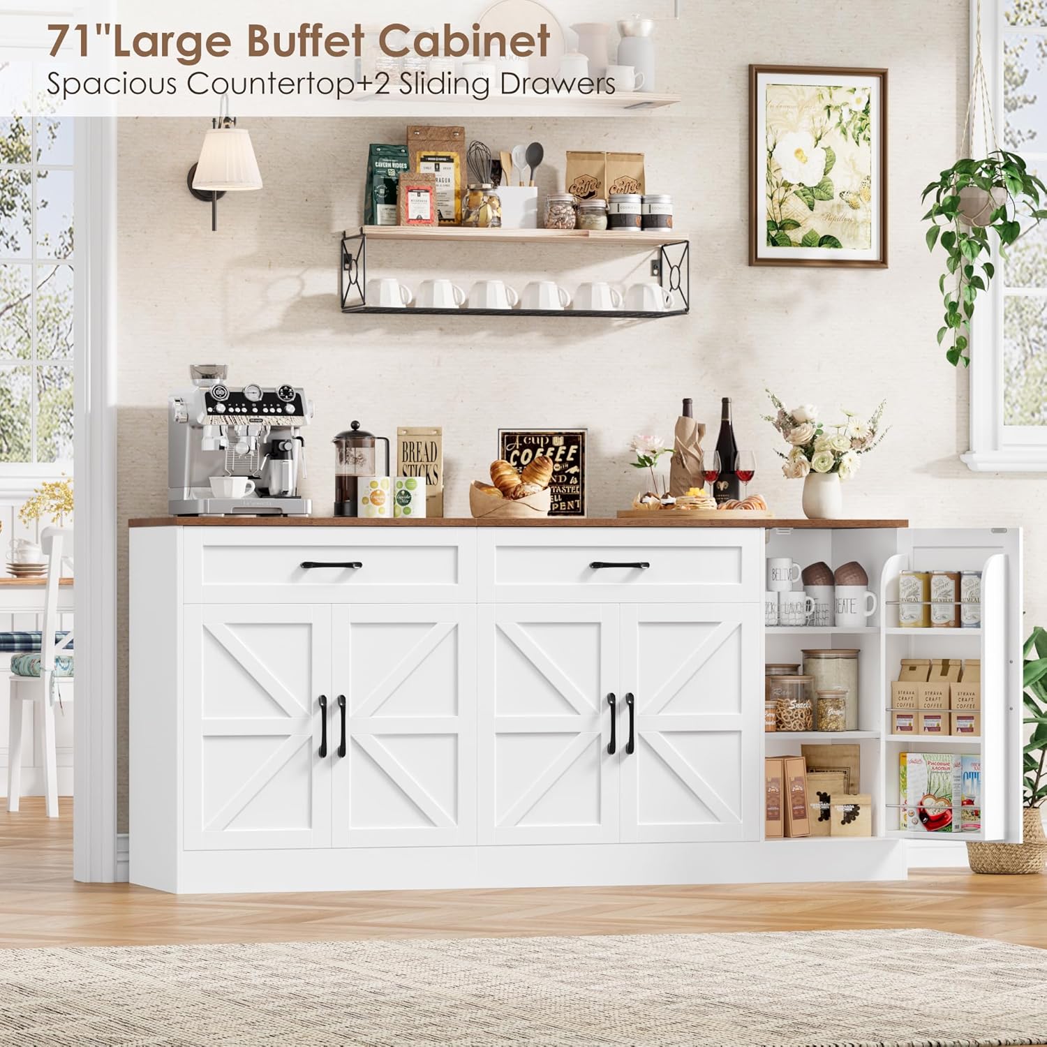Countertop & Heavy-Duty Capacity: This massive 71-inch buffet cabinet features an expansive countertop, perfect for setting up your coffee station, displaying decor, or serving meals. Built with strong load-bearing construction, it reliably holds heavy appliances, kitchen essentials, and decorative items without wobbling