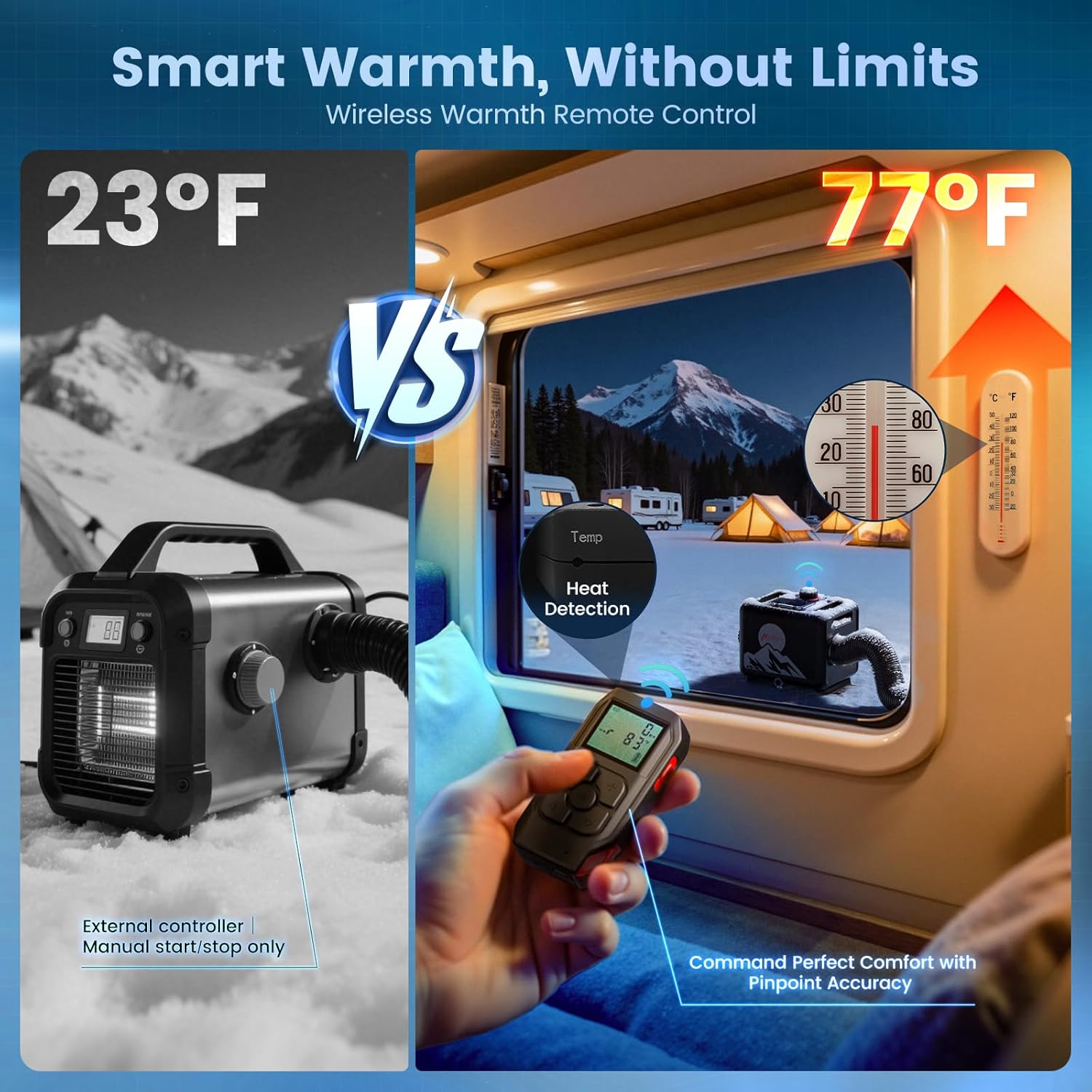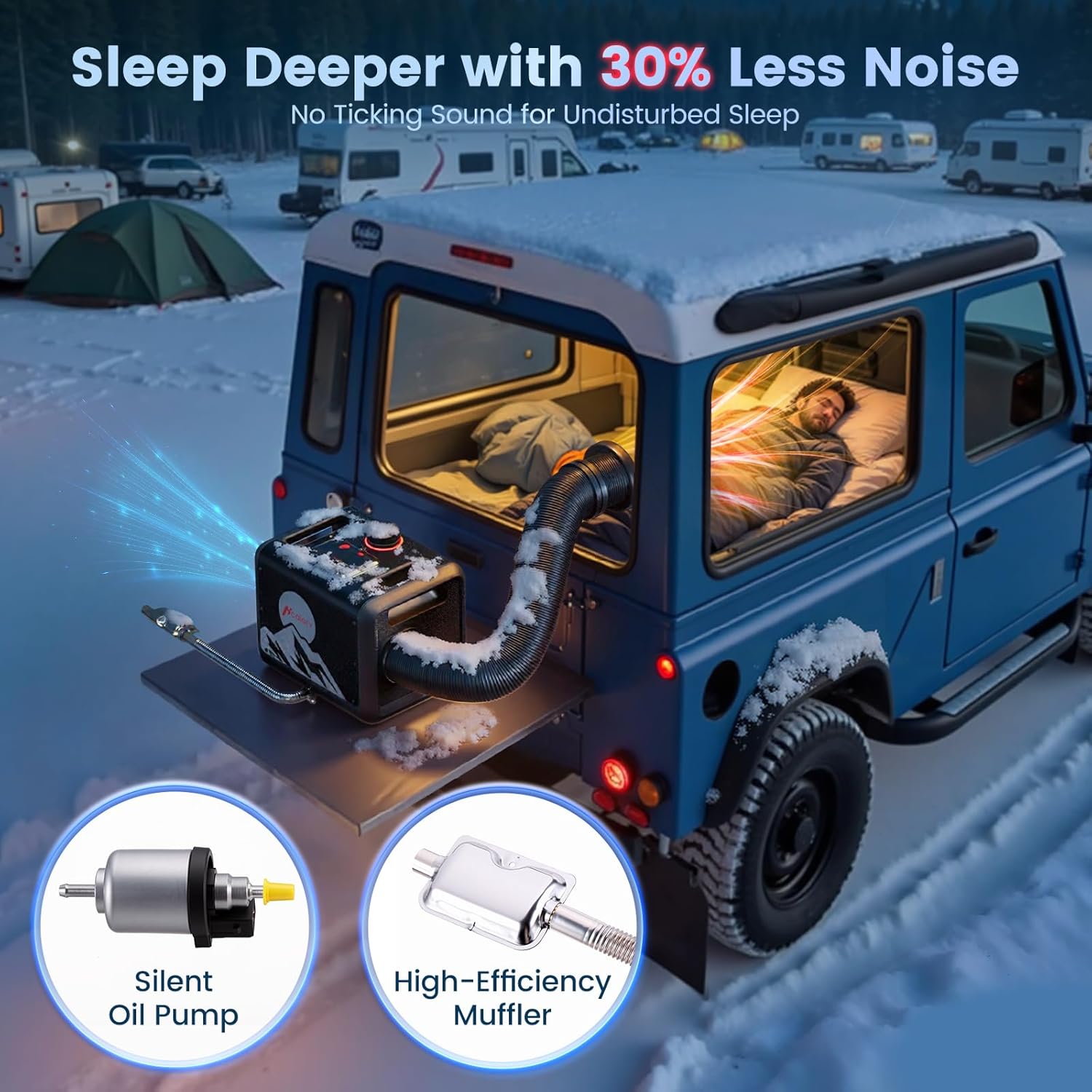 Quiet Operation with Silent Fuel Pump The air duct outlet remains the primary noise source (65 dB equivalent to normal conversation) but our upgraded silent fuel pump eliminates the irritating ticking sounds found in traditional heaters. Perfect for uninterrupted sleep in vans cabins or tents. Enjoy reliable warmth all night without the disturbance of a humming heater.