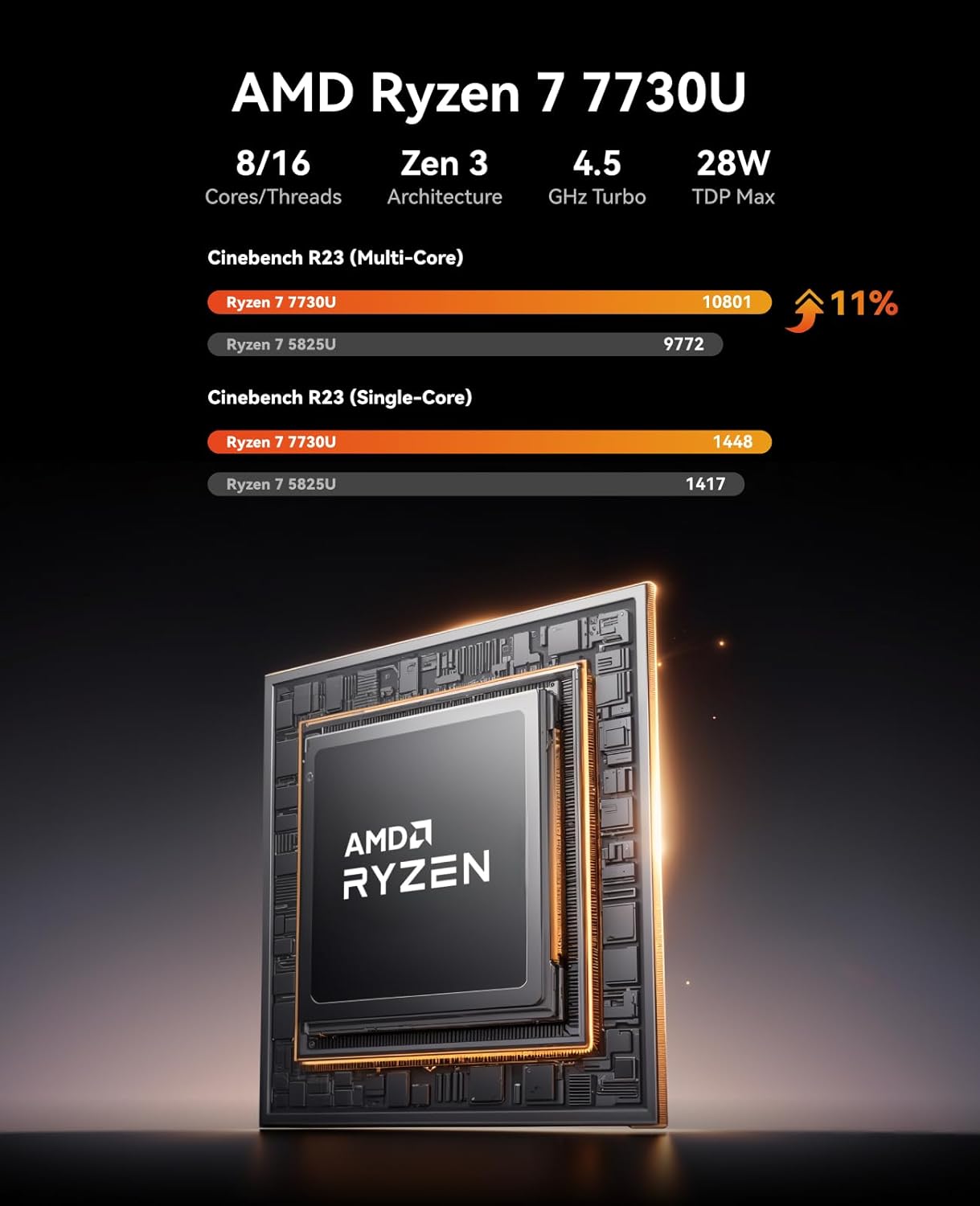 [AMD RYZEN 7 7730U PROCESSOR] Micro PC is equipped with AMD Ryzen 7 7730U processor (8C/16T 16M Cache up to 4.5GHz). Compared with AMD Ryzen 5(7430U/5600U/5500U)&Ryzen 7(5825U/5800U/5700U) K1 MINI PC 7730U CPU performance +35% GPU +38% more powerful performance and smoother running