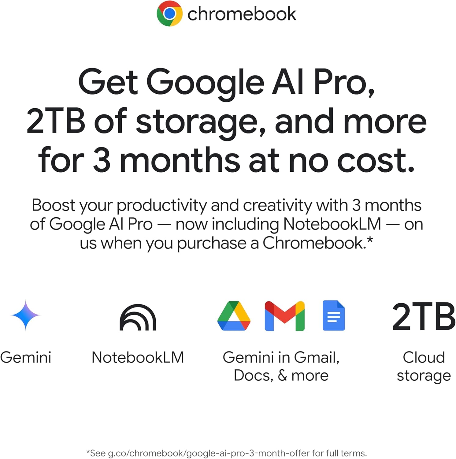 Get Google AI Pro 2TB of Storage and More for 3 Months at No Cost: Boost your productivity and creativity with 3 months of Google AI Pro -- now including NotebookLM -- on us when you purchase a Chromebook.(1)