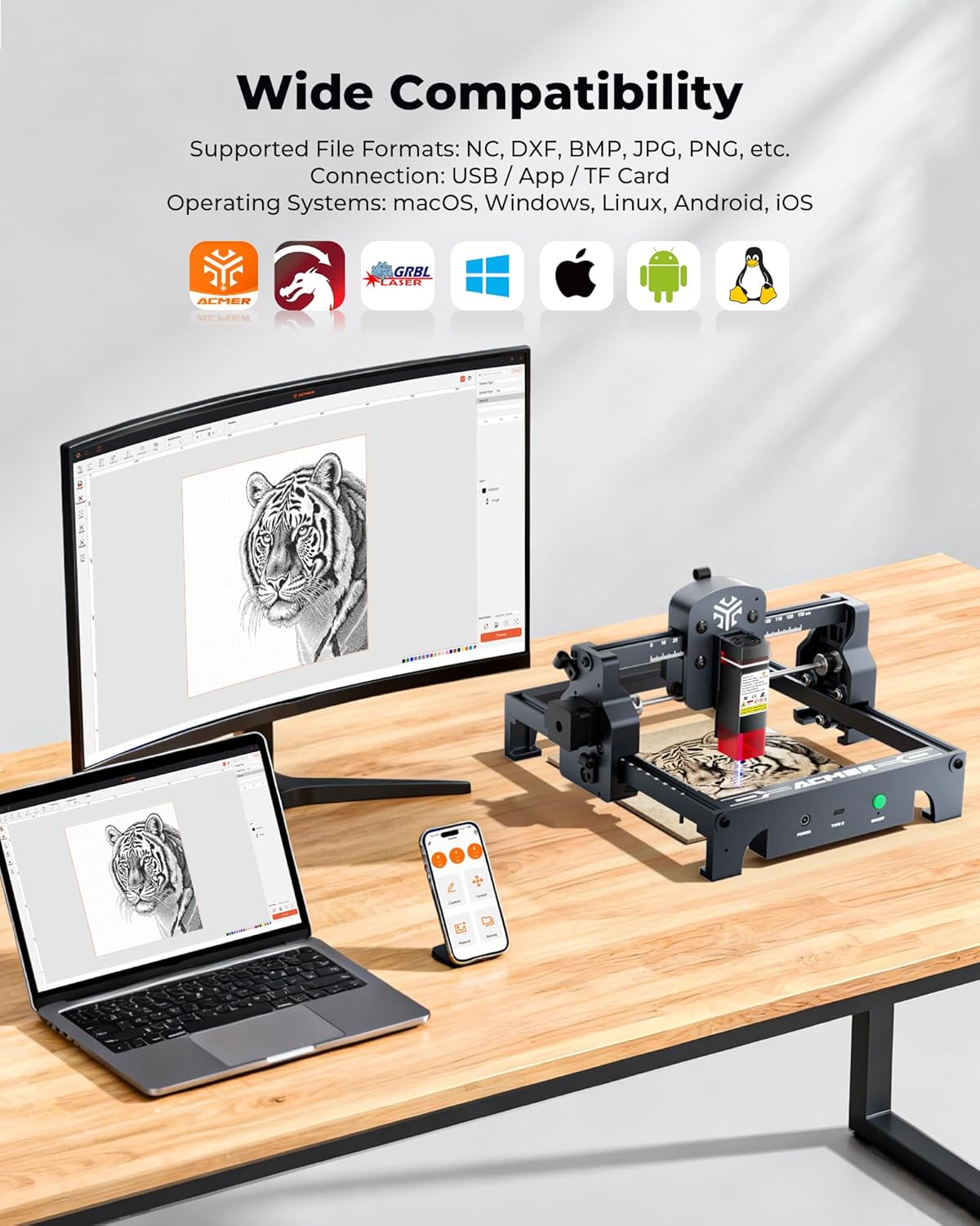 Broad Software Compatibility & Certified Safety: Works perfectly with LightBurn and LaserGRBL supporting NC DXF BMP JPG PNG and other common formats across macOS Windows and Linux. It is equipped with a multi-core processor for smooth control Class 4 laser safety NRTL certification IEC 60825-1 compliance a 12-month warranty and 24/7 customer support.