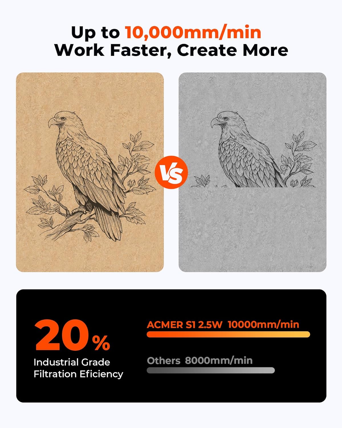 Ultra-Fine 0.04mm Laser Spot for Precision Results: Powered by a 6000mW diode laser and 24W machine output the S1 delivers crisp detailed engraving with a 4555nm wavelength and 2mm focal length. Achieve up to 10 000mm/min engraving speed with 0.01mm repeatable accuracy ideal for intricate patterns text artwork and professional crafting.