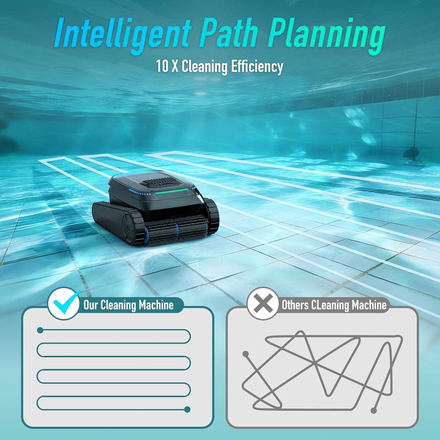 Smart Zigzag Navigation for Complete CoverageBuilt with an intelligent navigation system this pool cleaner robot follows a precise zigzag path to minimize missed spots and unnecessary overlap. Choose Auto Mode Floor-Only Mode or Wall-Only Mode to match your cleaning needs with a reliable pool robot vacuum.