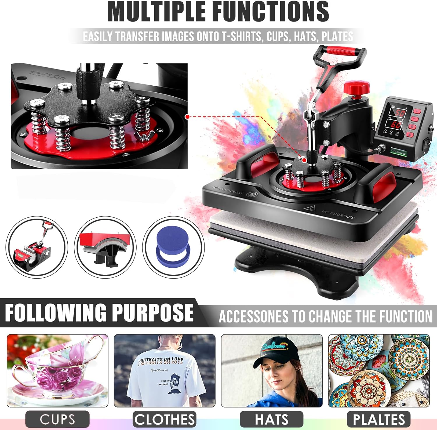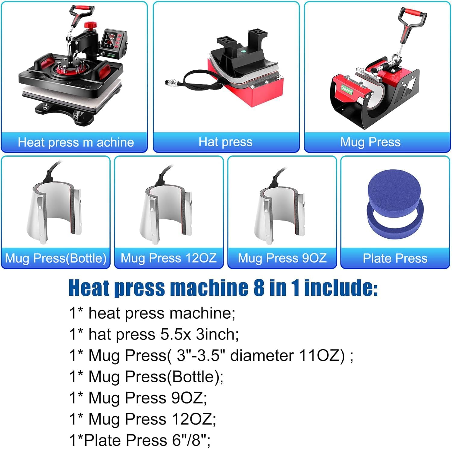 MULTIFUNCTIONAL 8 IN 1 HEAT PRESS COMBO- Wide Application shirt press machine it has all the necessary accessories for your DIY potential.The complete heat press kit for T-shirts caps ceramic plates mugs coasters mouse pads jigsaw puzzles lettering other materials.3 YEARS WarrantyWe provide three year warranty and Professional Repair Service.Any problems or questions contact us at any time.Well do our best to solve it