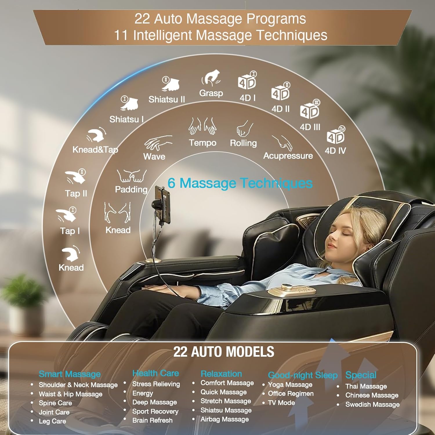 1Intelligent 4D Mechanism2Automatic Footrest3Multiple Massages4Full Body Airbags Massage5Heating Shawl Function1Deep Yoga Stretching2Zero Gravity & SL Track33 Control Methods4More Functions