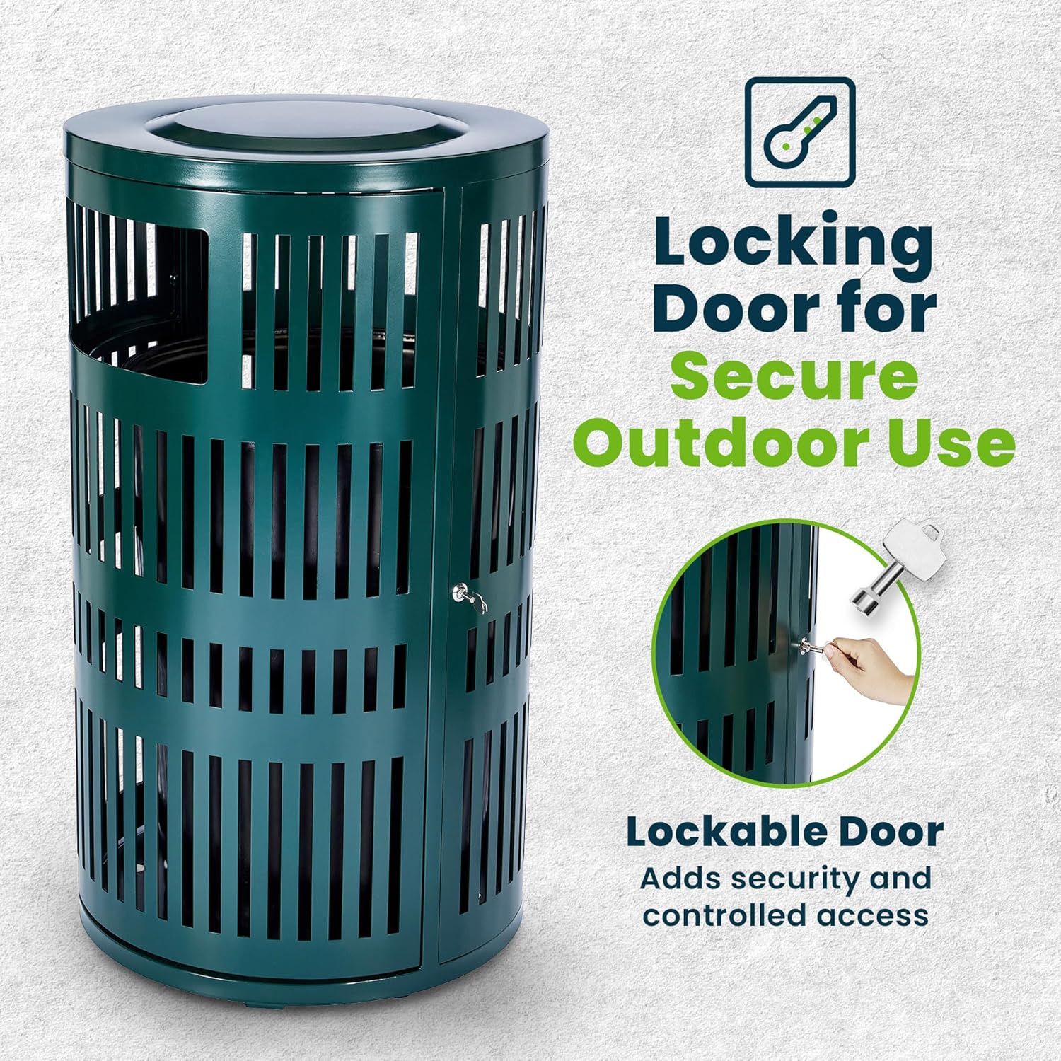 LOCKING DOOR FOR PUBLIC AREAS - Secure steel trash receptacle with built-in lock helps prevent tampering and unauthorized liner access in outdoor environments.
