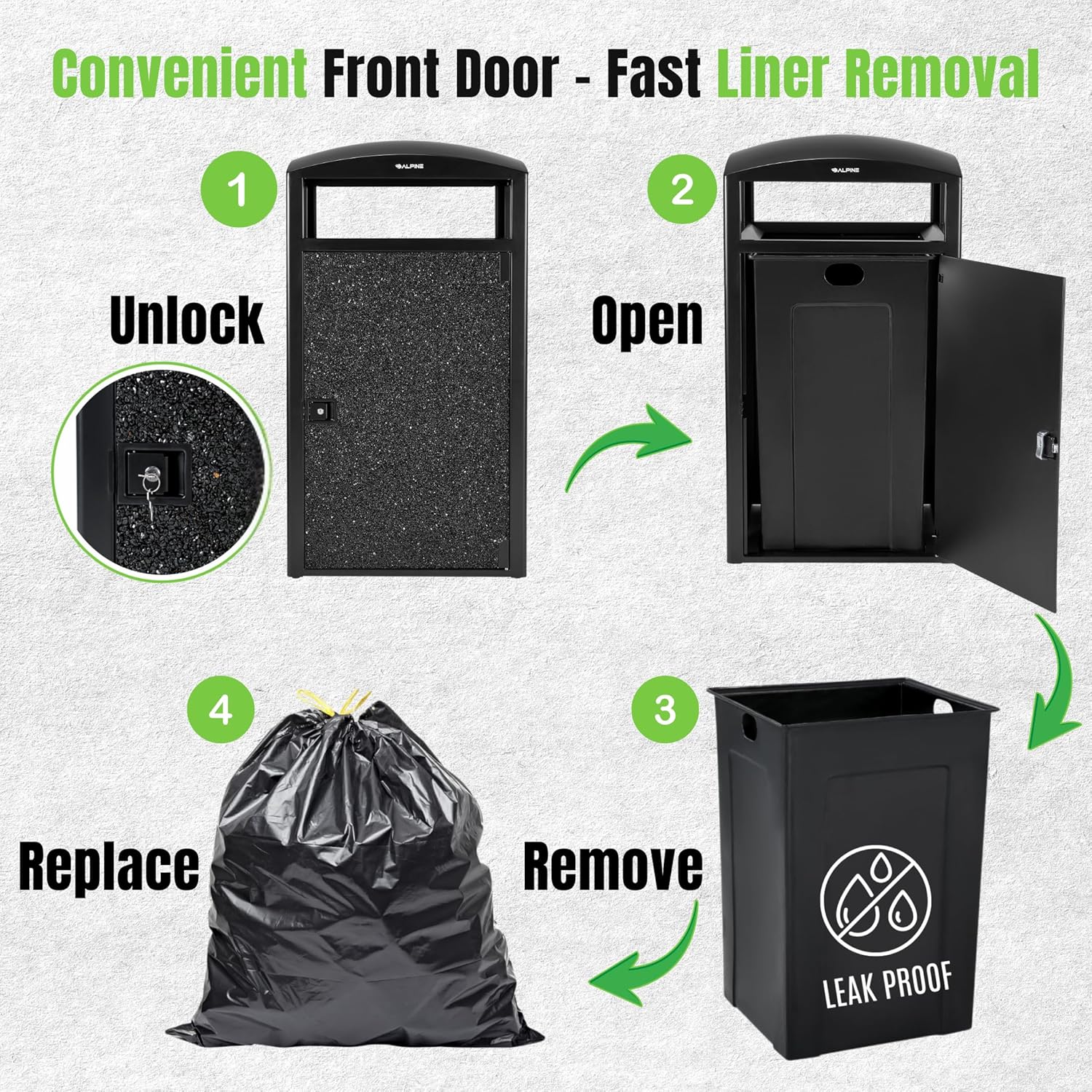Efficient Design: Features a lockable door, domed lid with wide openings for easy access from 4 side, and a sturdy plastic liner that is leakproof and removable for hassle-free maintenance.