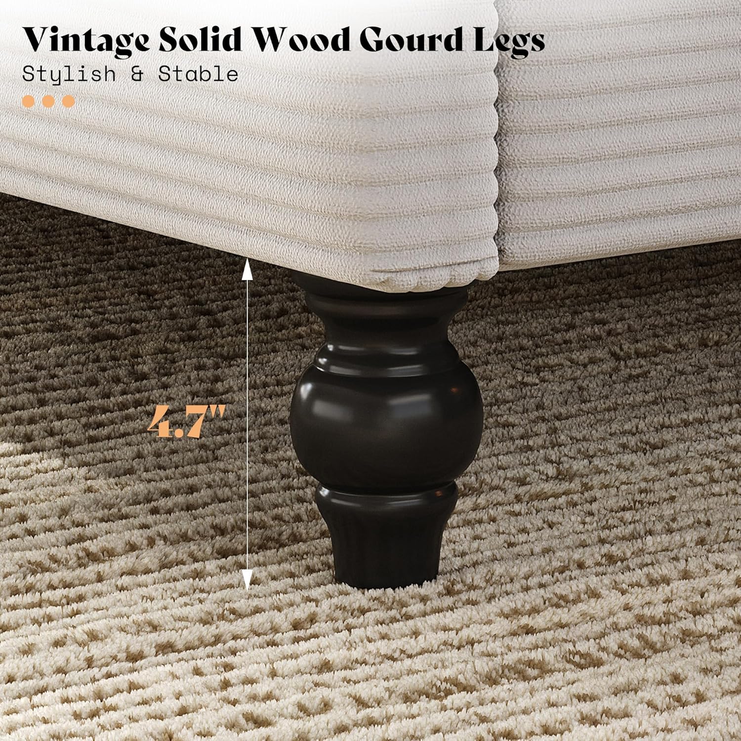 Stylish & Stable Designed with 4.7" vintage solid wood gourd legs, this corduroy bed frame blends classic style with durable stability, while the raised height allows easy under-bed cleaning and helps keep your bedroom tidy.