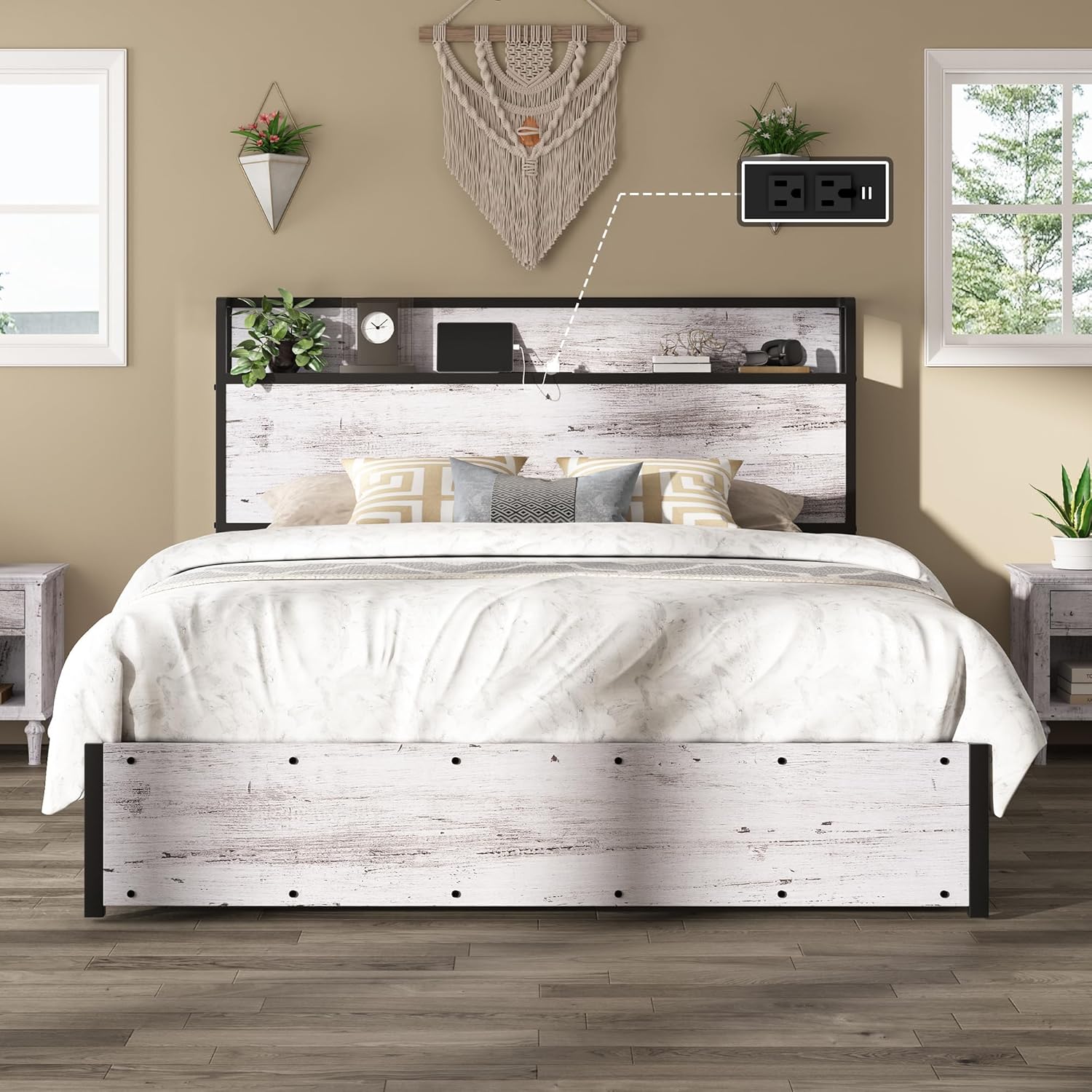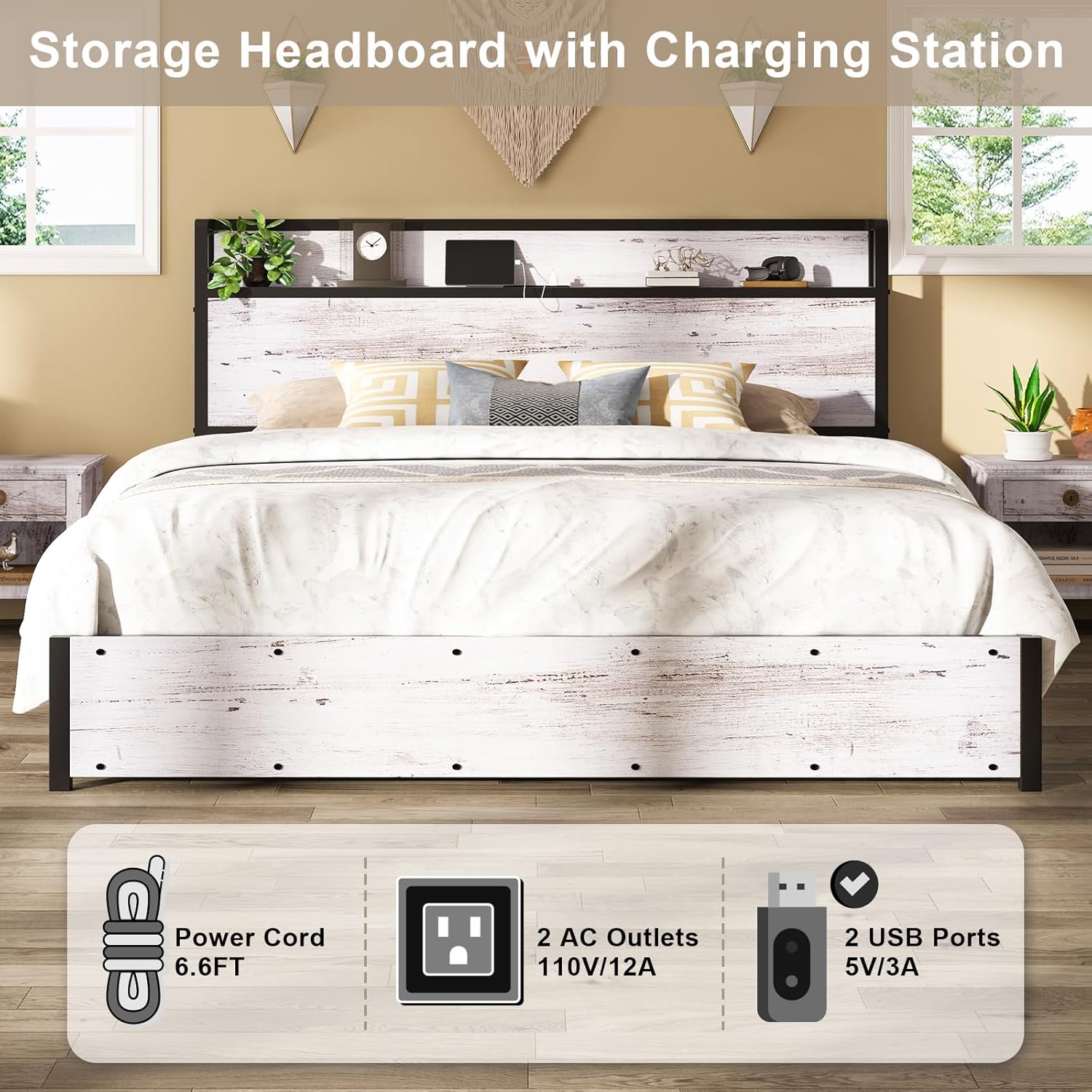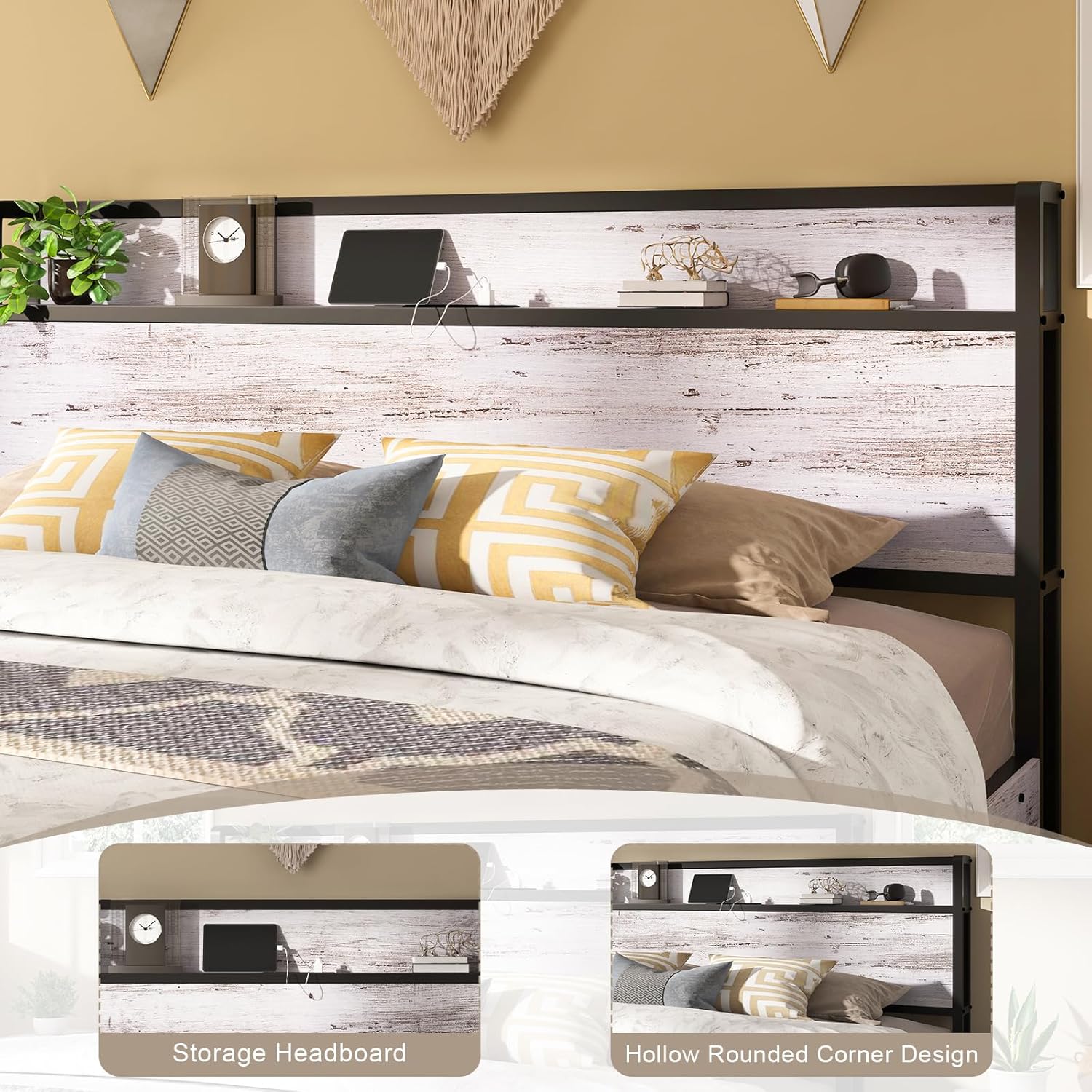 Chic Headboard: The wooden headboard not only has ample open storage space but also a charging station. Rounded edges & hollow design add a sophisticated touch of the bed frame.