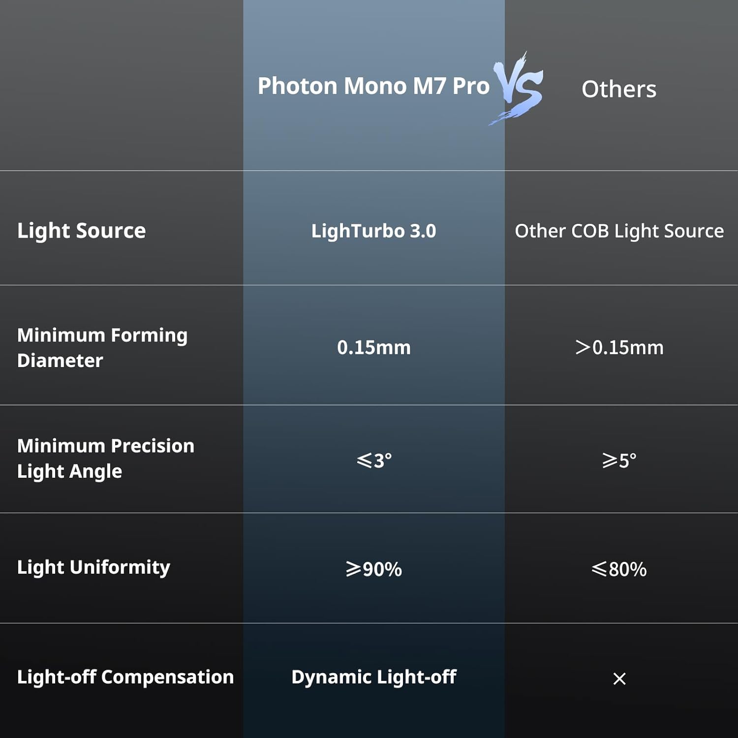 Advanced COB LighTurbo 3.0The COB light source system combined with Fresnel lenses and front-facing reflectors can reach the light angle within 3 and light uniformity is more than 90%. LighTurbo 3.0 is also equipped with a light-off compensation algorithm which ensures that every layer of the model is successfully exposed and removed from the mold significantly improving the printing success rate