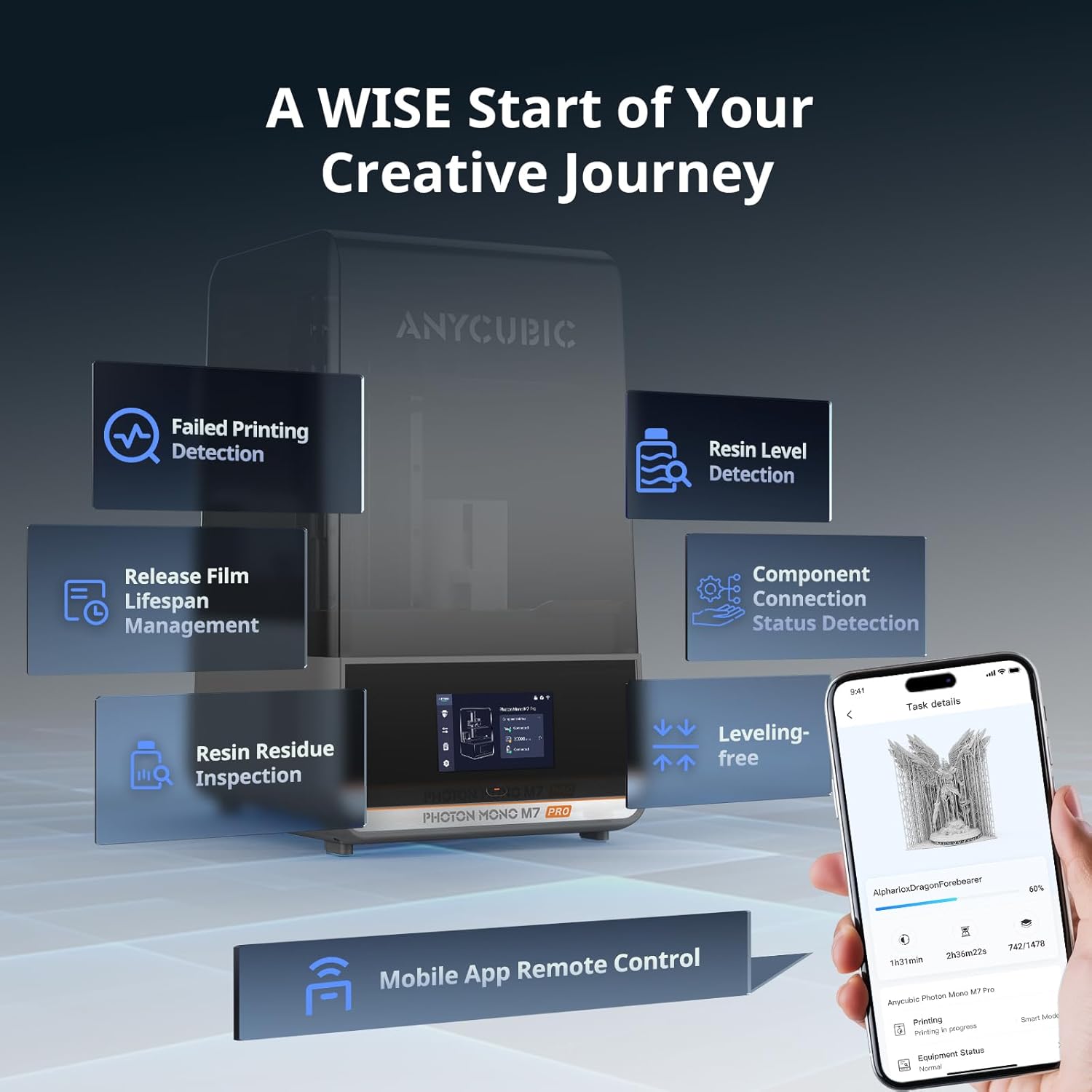 Intelligent DesignBuilding on component connection status detection residue detection resin level Detection failed print detection and release film lifespan management Photon Mono M7 Pro has added build plate installation detection. 6 types of intelligent detection can achieve startup detection simplify the printing process and reduce problems caused by misoperation