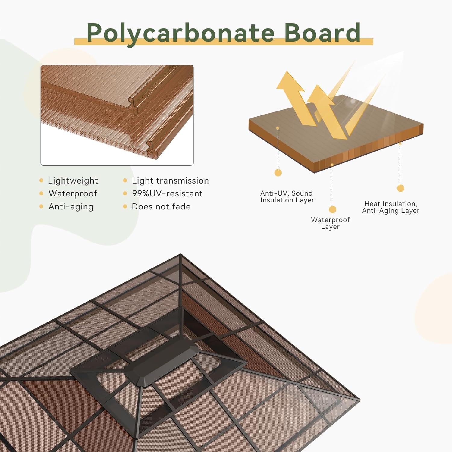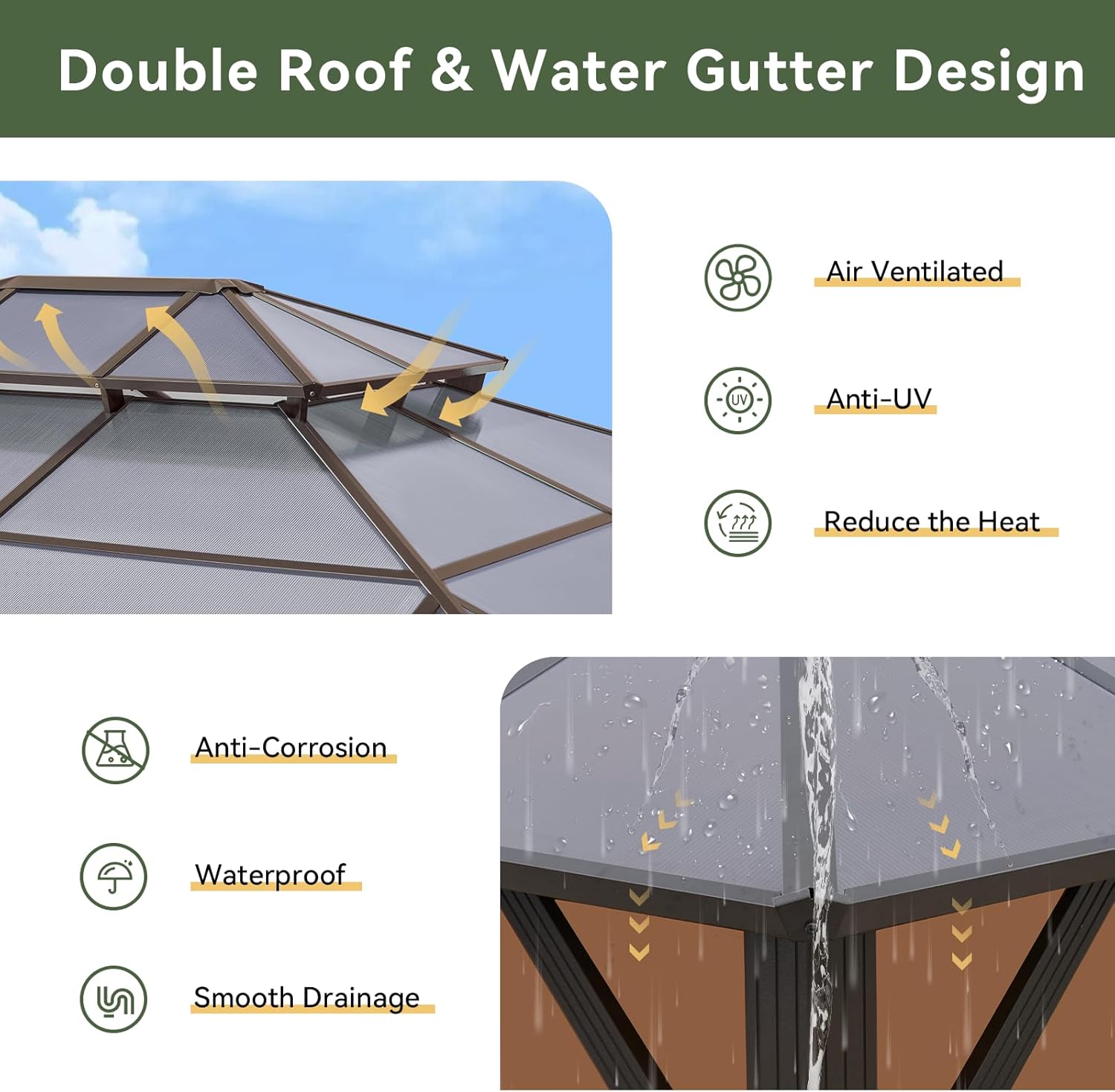 Broad Application: The product is spacious enough to accommodate many people at a time to attend parties or activities which is a great choice for you and your family and this hardtop gazebo is perfect for backyard patio lawn and more