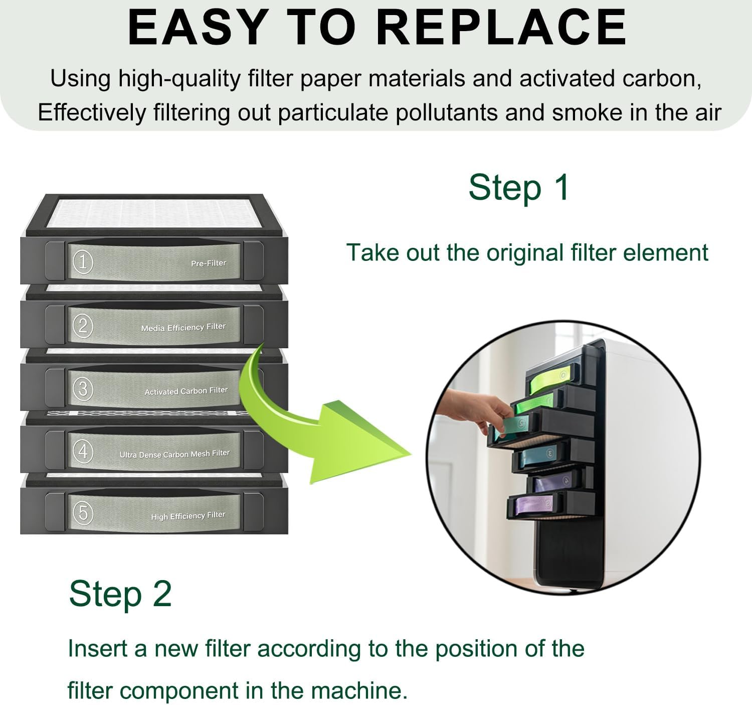 Air Filter Replacement compatible with ap2 Air Purifier 3 in 1 Activated Carbon filter The installation order is from bottom to top from No.5 to No.1. First steps is to install number 5 next step is number 4 third step is number 3 The forth step is number 2 and the last step is to install number 1.