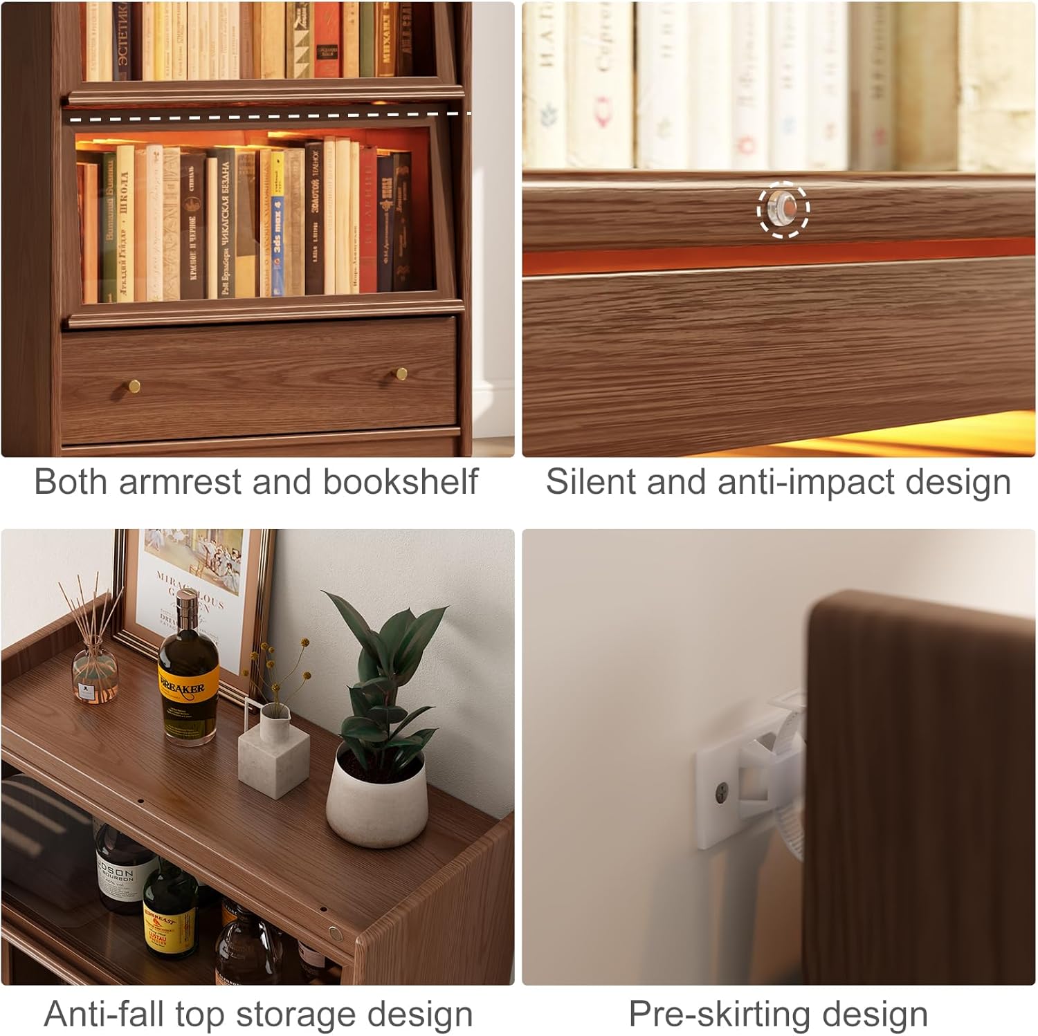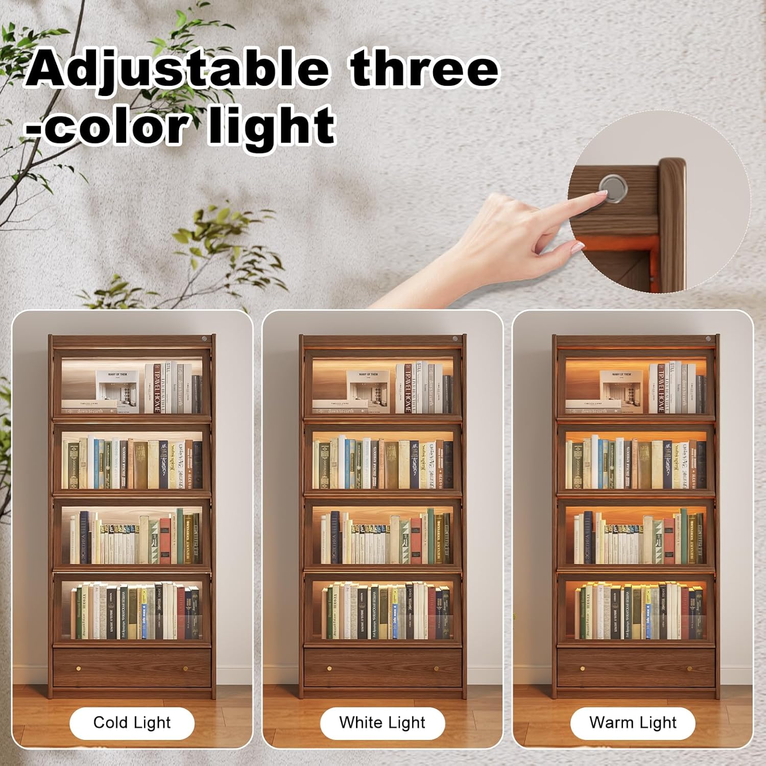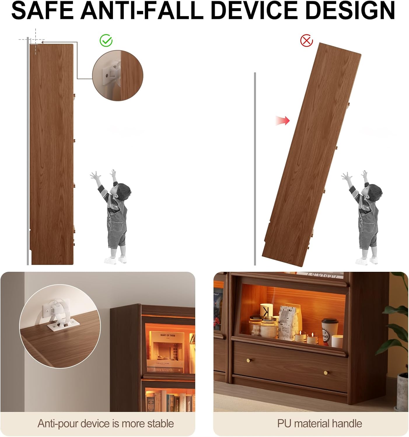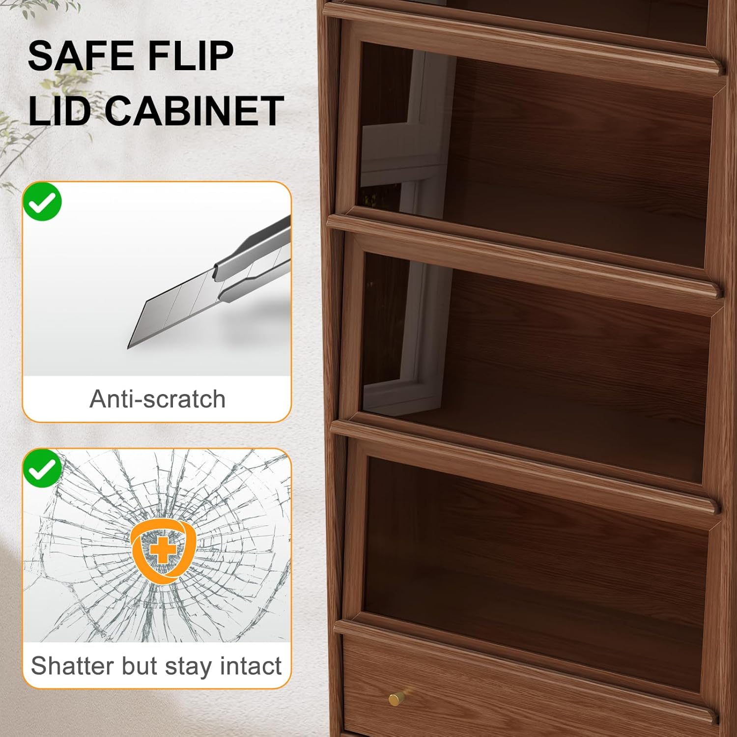 5 tier bookshelves, more than bookcase with Tempered Glass Flip-Up doors:All our furniture products, glass front wood bookshelf made of solid wood & reinforced glass, we only do solid wood furniture, do not use fiberboard, density particle board, compressed board, from the source to solve the ring easy to crack, burr, glue, formaldehyde more problems
