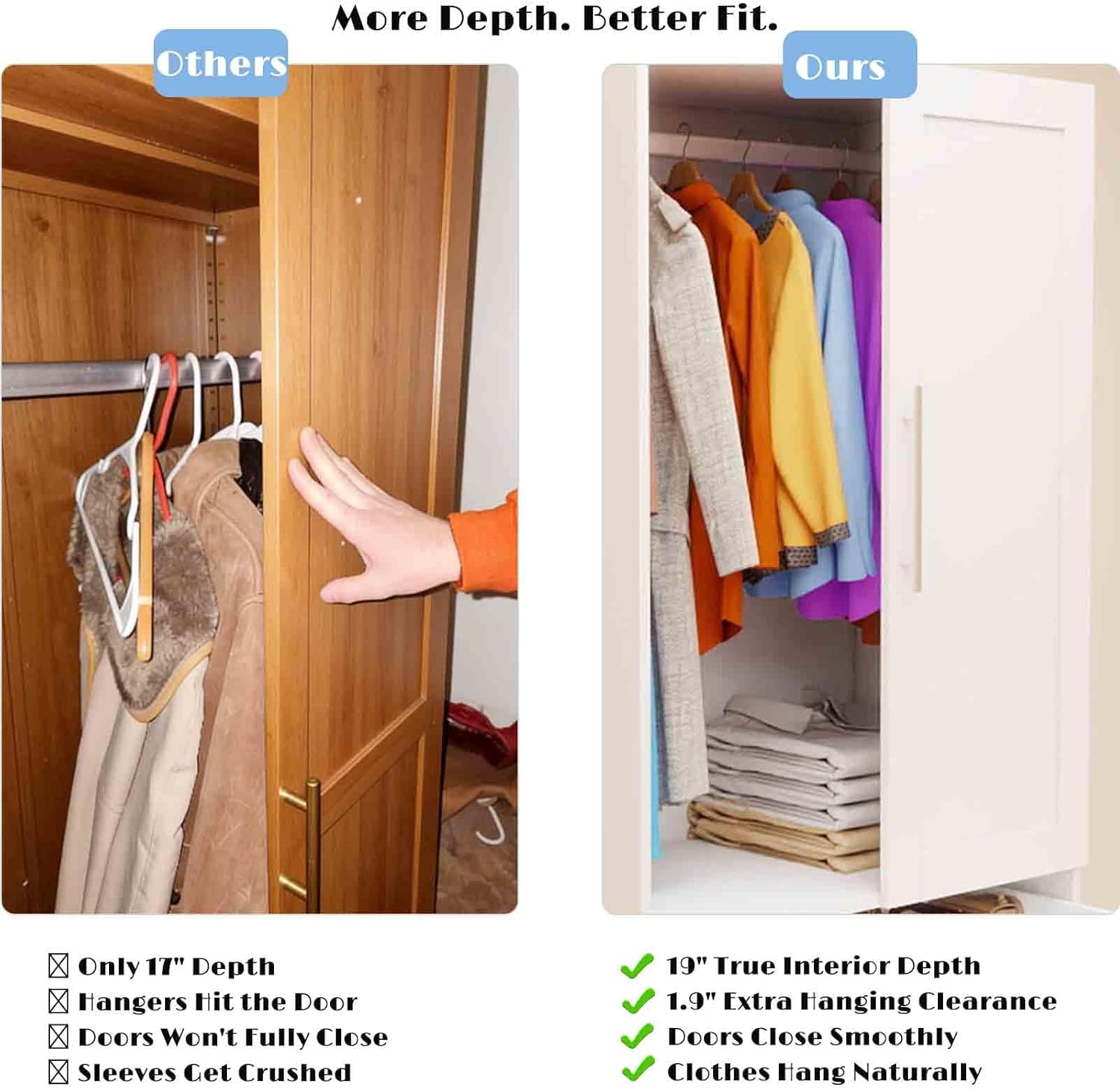 Stop Fighting Your Closet Doors 19" True Interior DepthToo shallow closets crush sleeves and jam hangers. Our wardrobe offers 19" interior depth with 1.9" extra clearance, letting clothes hang naturally and doors close smoothly every time. Compared to standard 18" closets, you get full hanger fit, no crushed clothing, and maximized storage space.