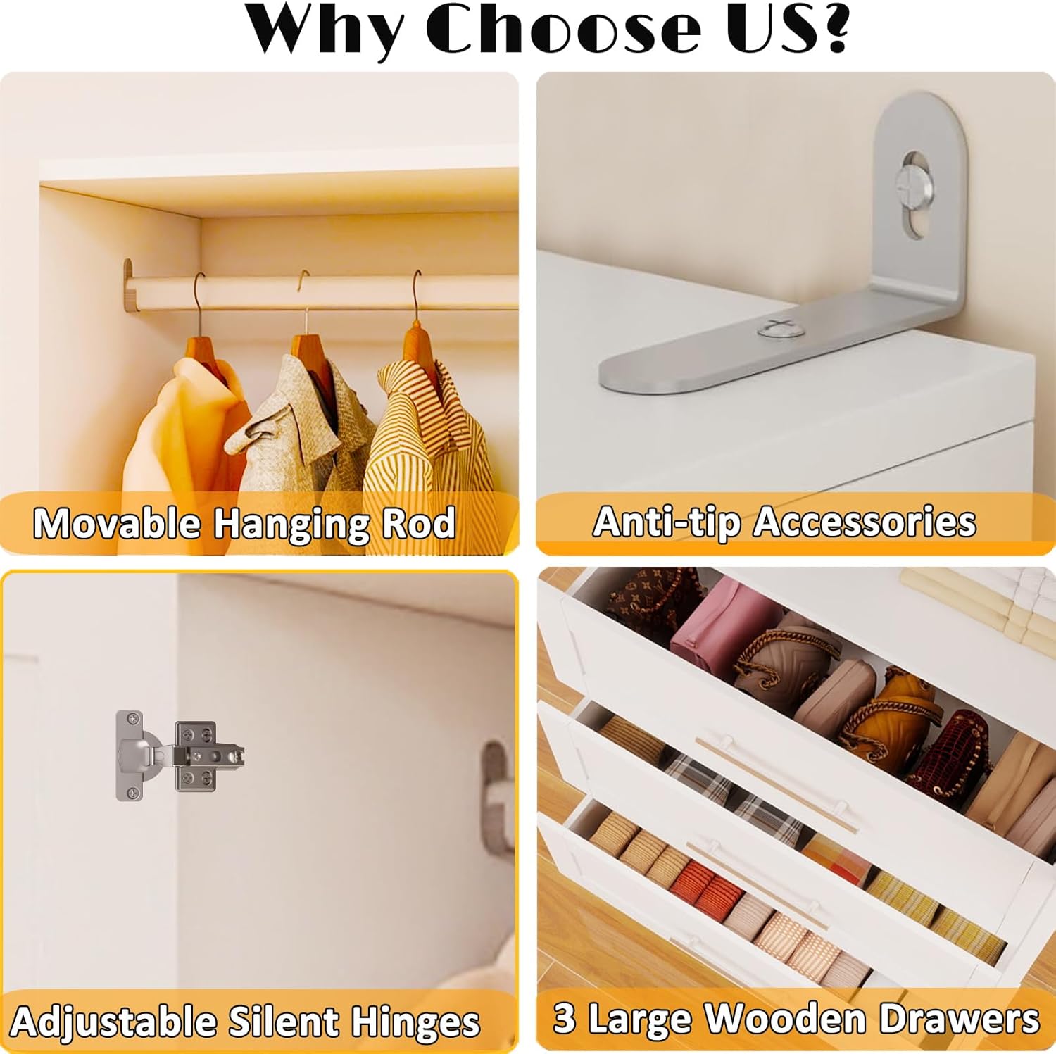 Heavy-Duty Base with Kick Plate DesignCrafted from high-quality engineered wood, this wardrobe features a reinforced heavy-duty base with an integrated kick plate that helps prevent scuffs and damage while enhancing overall stability for daily use. An anti-tip device adds extra safety, while cushioned hinges and smooth, silent metal drawer rails ensure quiet operation and long-lasting durability.