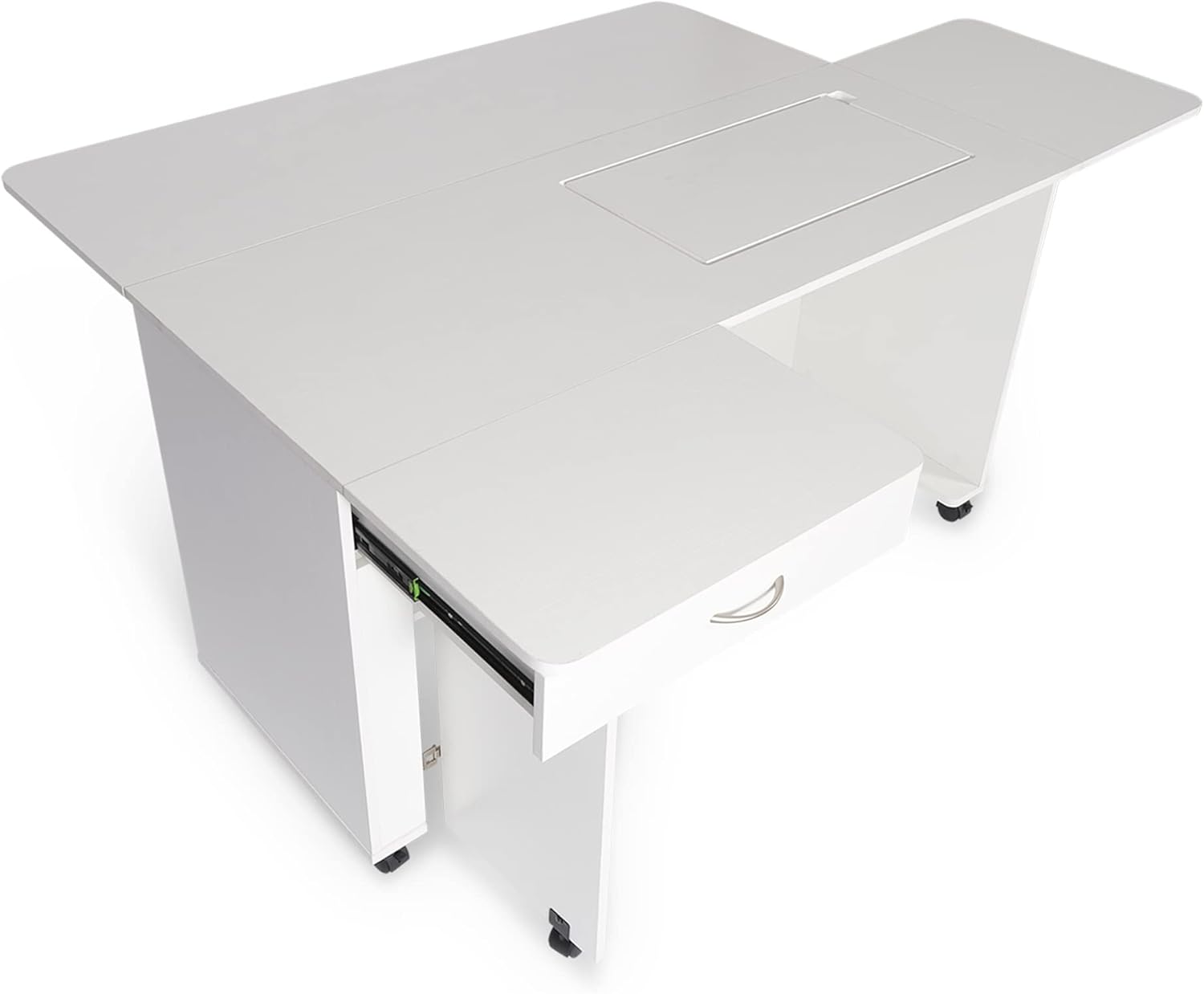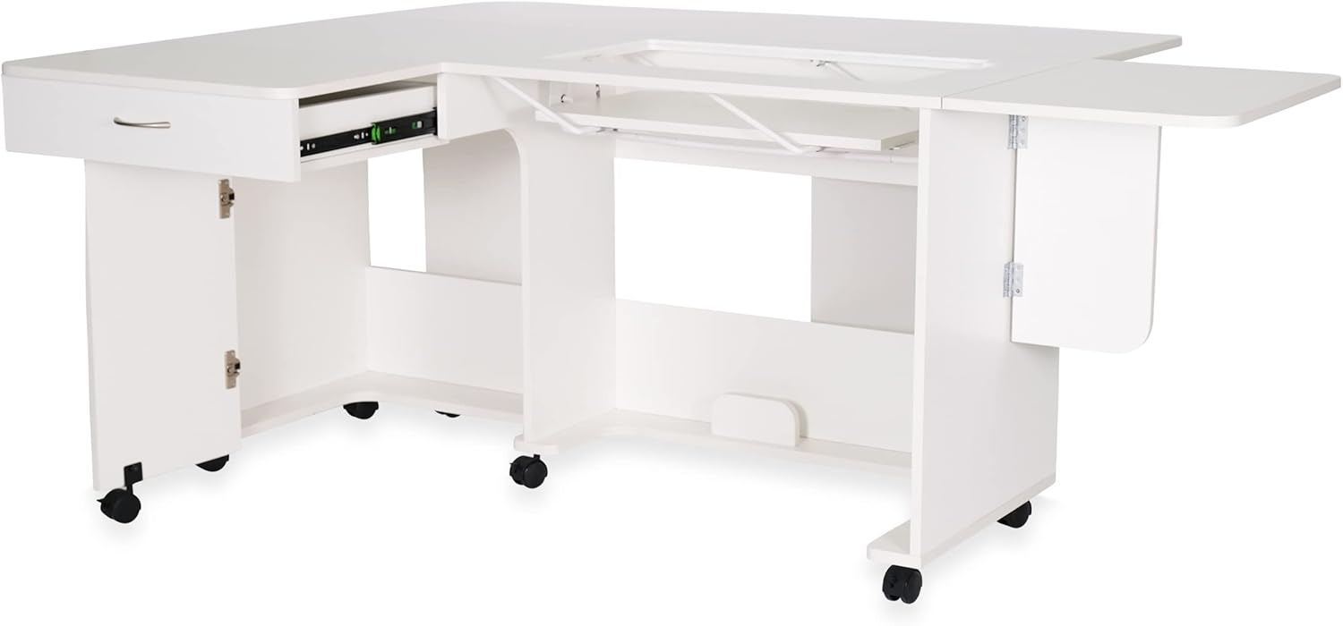 Rear quilt leaf and side leaf expand work surface to keep large projects from pulling or laying on floor