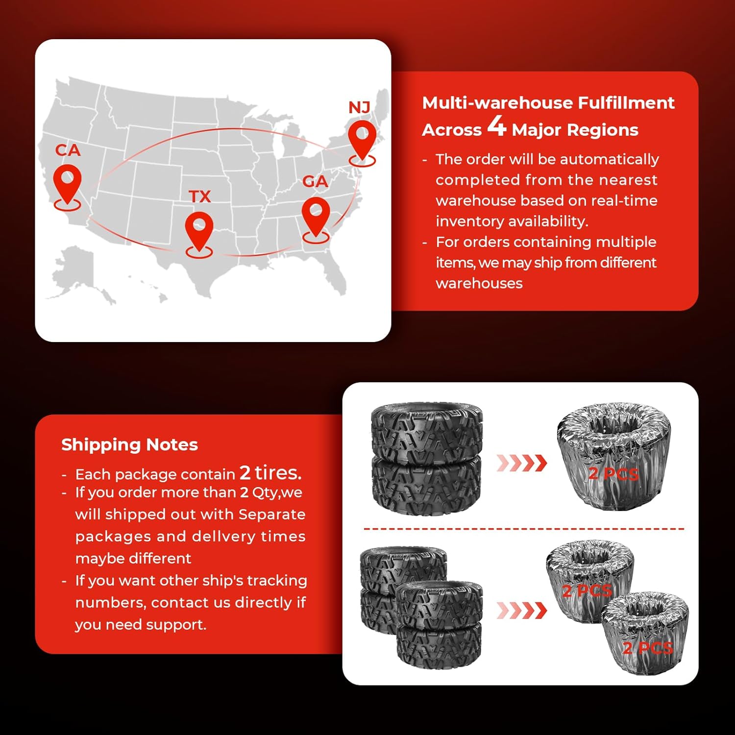 Package & Notice: 26x9-12 2pcs ATV/UTV tires. Rim(s) NOT included.NOT FOR HIGH WAY SERVICE!!!Notice: If purchasing more than two tires your order may arrive in multiple packages.Please contact us for tracking information if you didn't receive the entire order