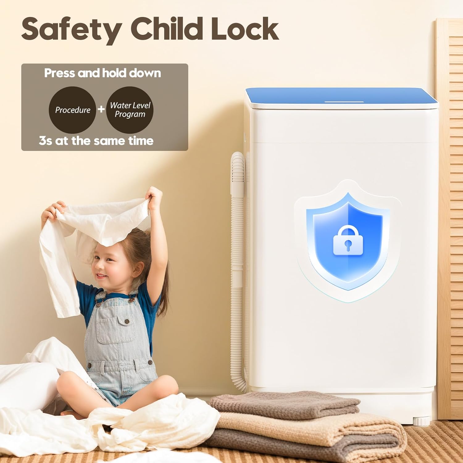 [User-Friendly & Child Safety Lock] This compact washing machine is easy to operate with a simple On/ Off and Start/ Pause button. The safety lock instantly blocks control panel access during cycles eliminating accidental setting changes with simple button (Procedure + Water Level) hold (3 sec).