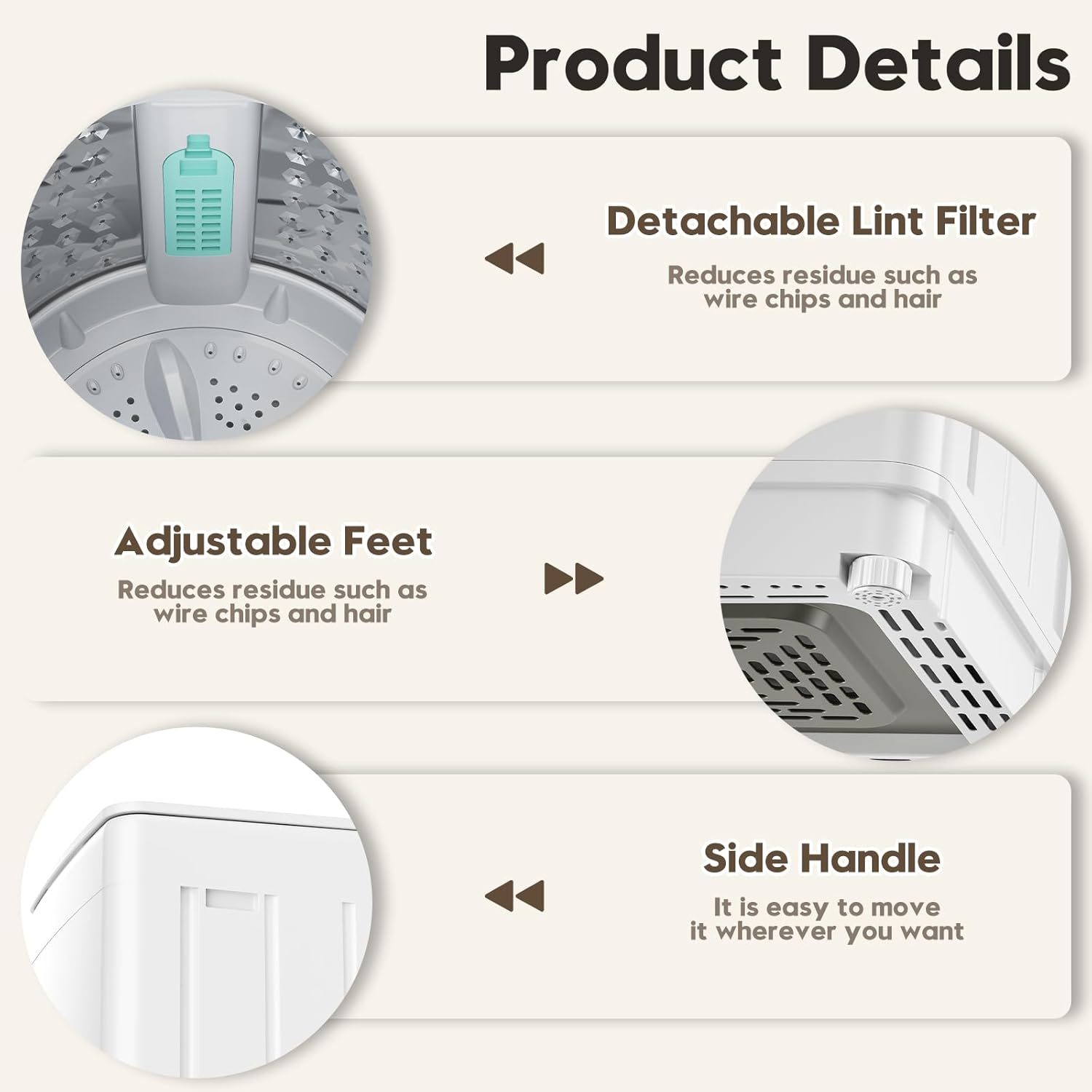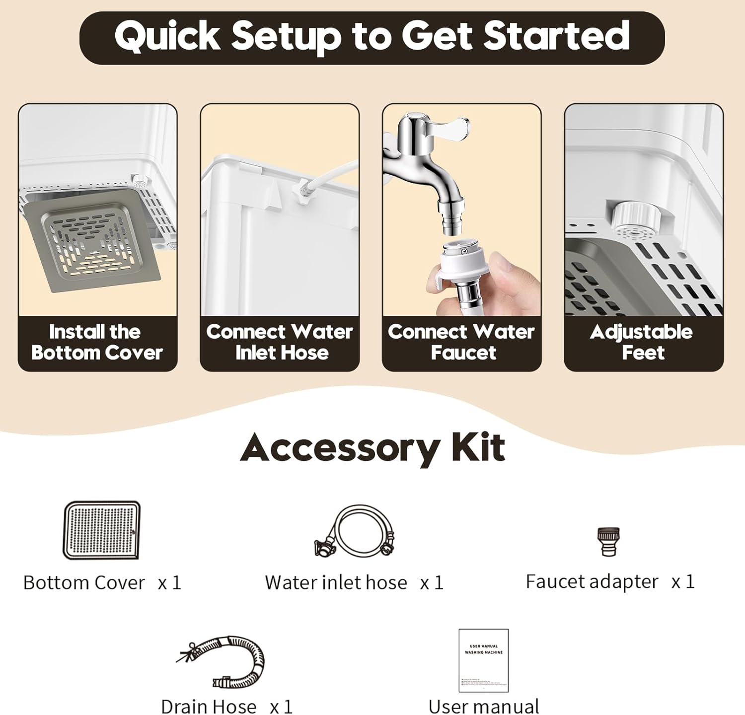 [Compact & Space-Saving Design] With dimensions of just 20" x 20" x 33.7" this portable washer is designed to fit perfectly in spaces like apartments dorms and RVs. It also comes with a faucet adapter for easy installation ensuring that it meets the water inlet requirements.