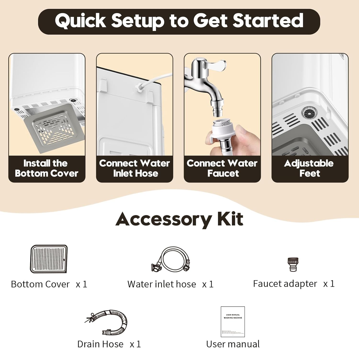 [Compact & Space-Saving Design] With dimensions of just 23" x 23" x 36" this portable washing machine is designed to fit perfectly in small spaces like apartments dorms and RVs. It also comes with a faucet adapter for easy installation ensuring that it meets the water inlet requirements.