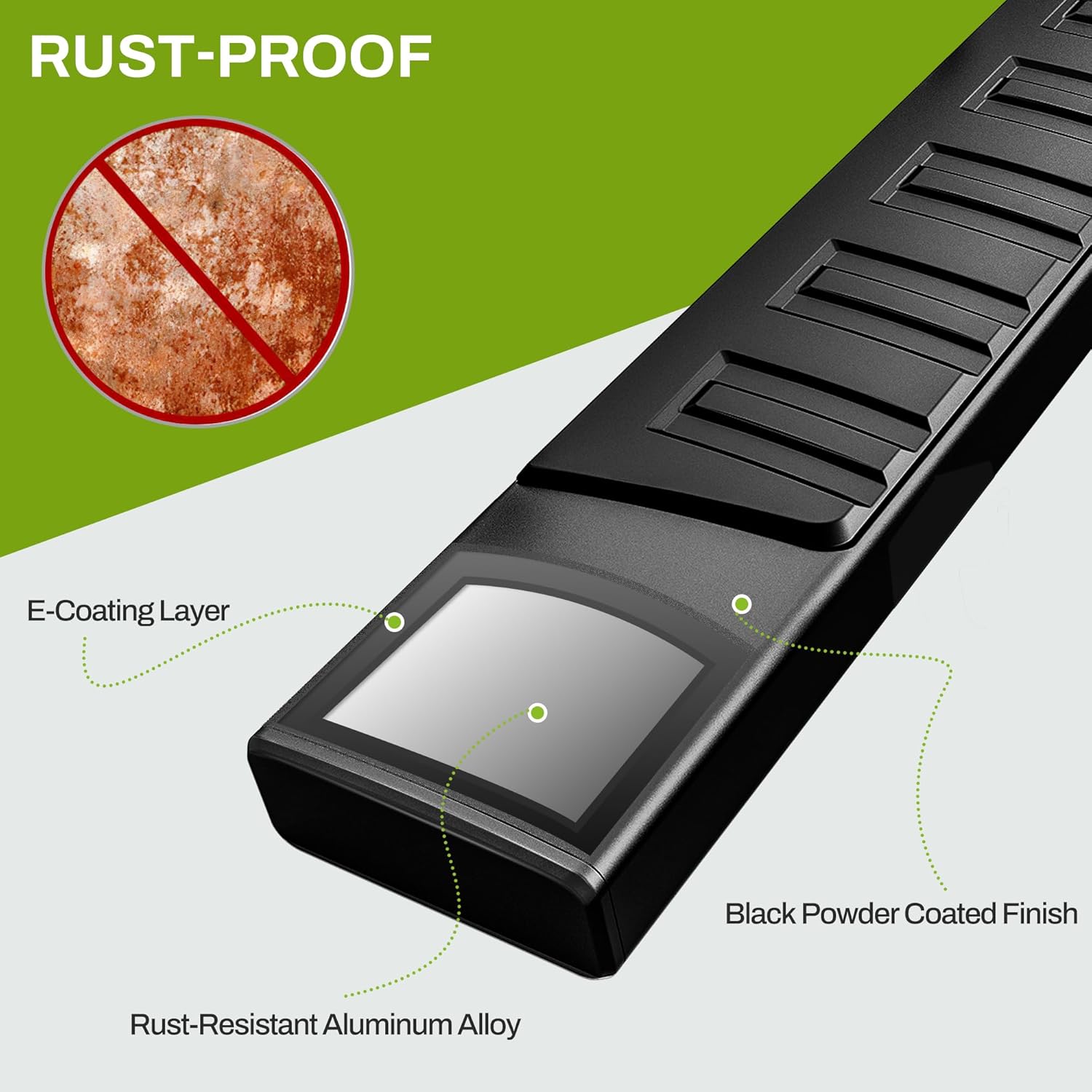 Running boards structure provides strength and durability. The 6-inch non-slip injection step pad allows for easy movement such as stepping in stepping out and even jumping (450 lb. capacity)