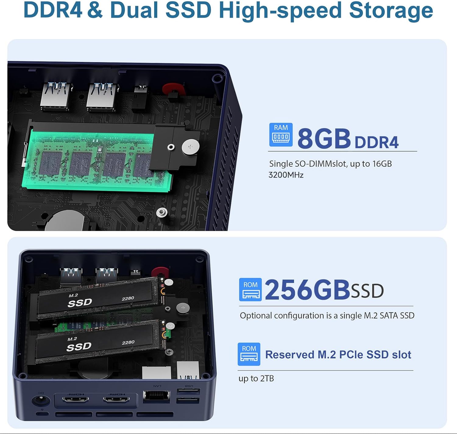 8GB DDR4 + 256GB SSDThe N95 Mini PC comes with 8GB SO-DIMM DDR4 3200MHz memory for smooth multitasking plus a 256GB M.2 SSD that ensures rapid boot times and quick data access. Storage is expandable via a dual-storage design: upgrade the M.2 SSD up to 2TB or add a 2.5-inch SATA HDD/SSD (up to 2TB not included) for excellent storage flexibility