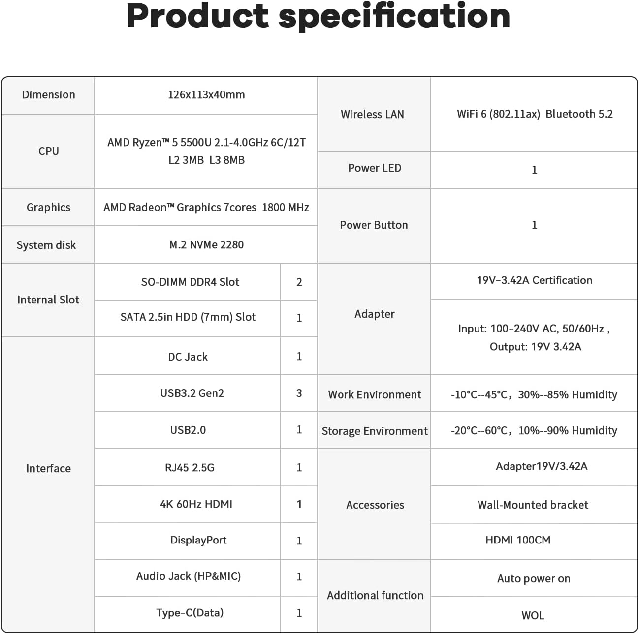 Multiple Interfaces & WirelessMini Desktop PC equipped with a 2.5G LAN (RJ-45 supporting Gigabit file transfer speeds) Dual-band 2.4G 5G WiFi (802.11ac stronger capacity of resisting disturbance) and built-in Bluetooth high-speed wireless connection makes you step ahead. And 3*USB3.2 ports 1*USB2.0 ports 1*HDMI ports 1*Type-C port(Data&Video) and 1*Audio Jack (HP&MIC) 1*DC Jack thus offering the user even greater versatility in use.
