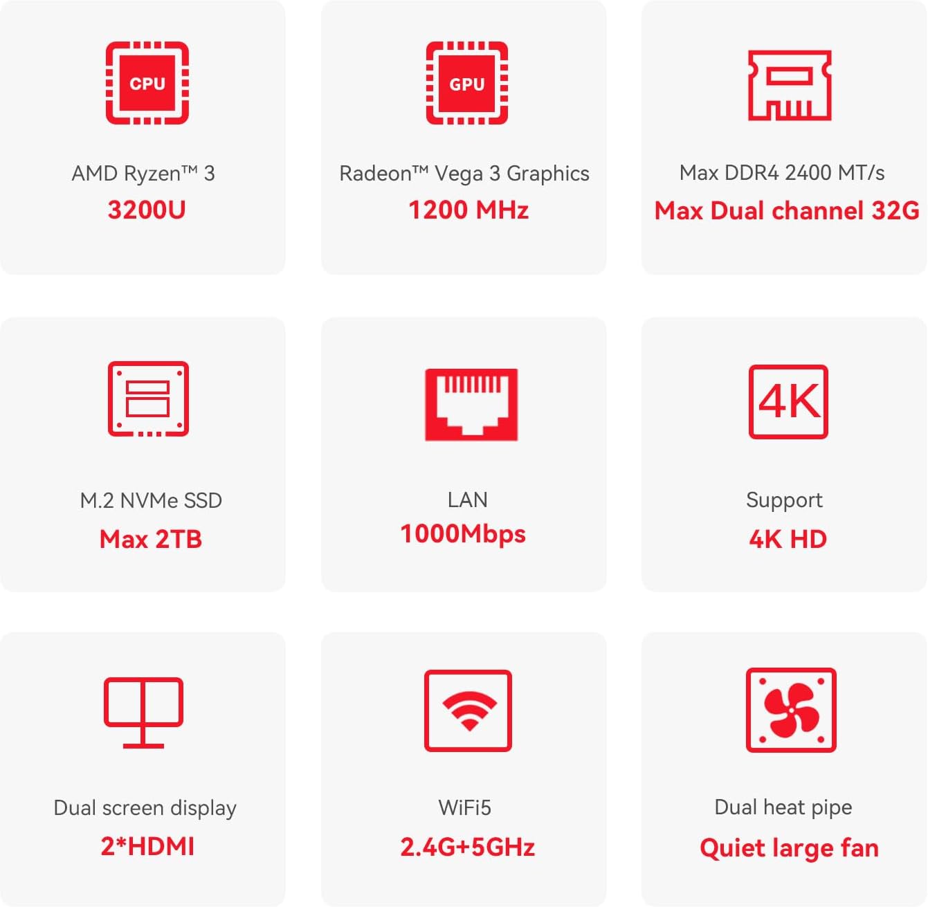 UHD 4K@60HZ & DUAL DISPLAY 3200U integrates Radeon Vega 3 Graphics 3core 1200 MHz GPU to deliver powerful graphics processing power to easily handle the demands of complex design software 4K@60Hz UHD video editing and playback or light gaming. And it can connect 2 screens efficiently handle your tasks and meet your specific needs.