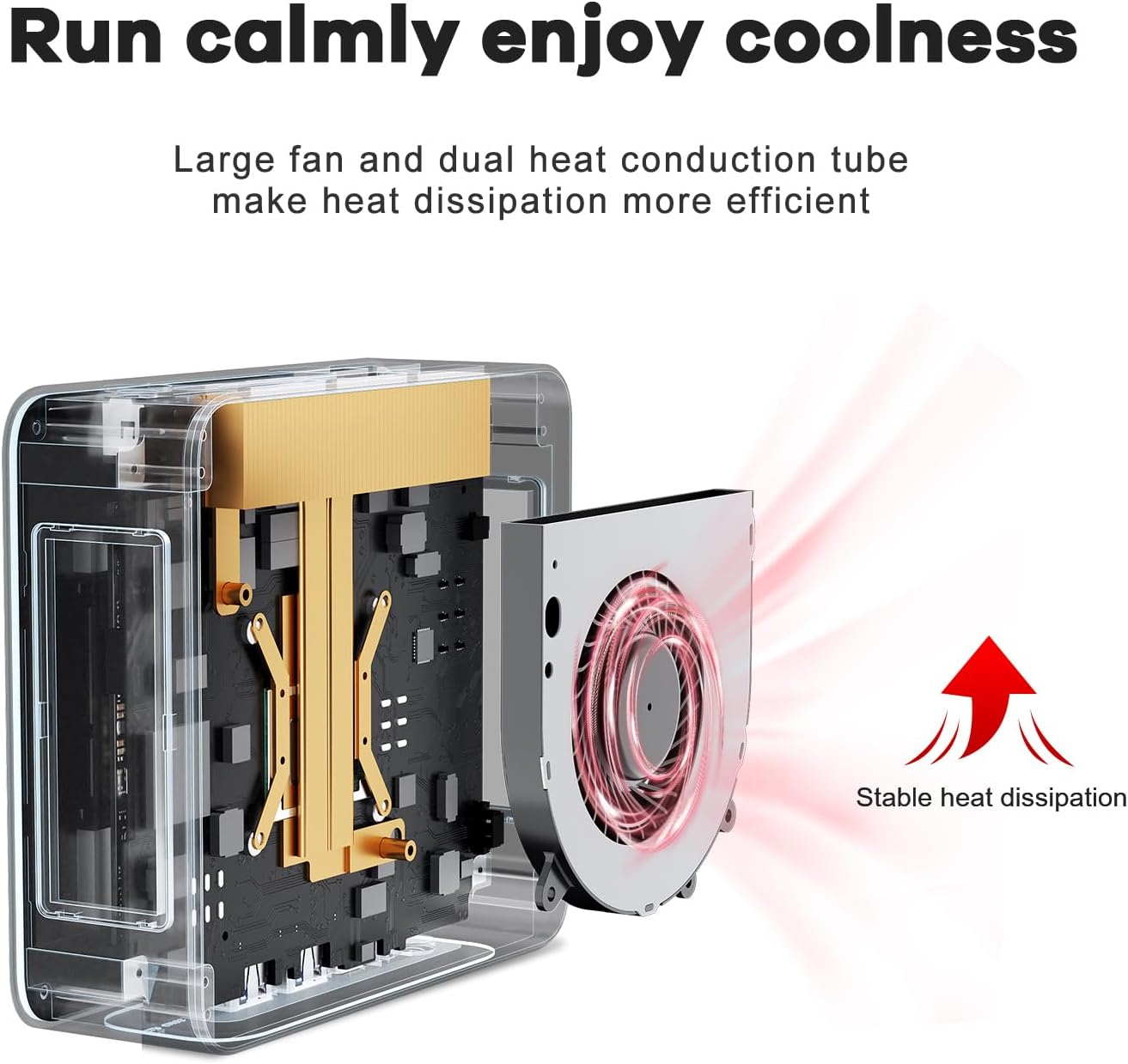 Efficient Cooling System & WIFI 6This mini pc is designed with cooling fan and dual heat conduction tube to provide efficient cooling for CPU and machine.It is also equipped with WIFI 6 which is about 3 times faster than WiFi 5 lower latency Bluetooth5.4 more stable and efficient to connect to multiple wireless devices and RJ45 2.5G network connectivity to enjoy smooth traffic and low latency.