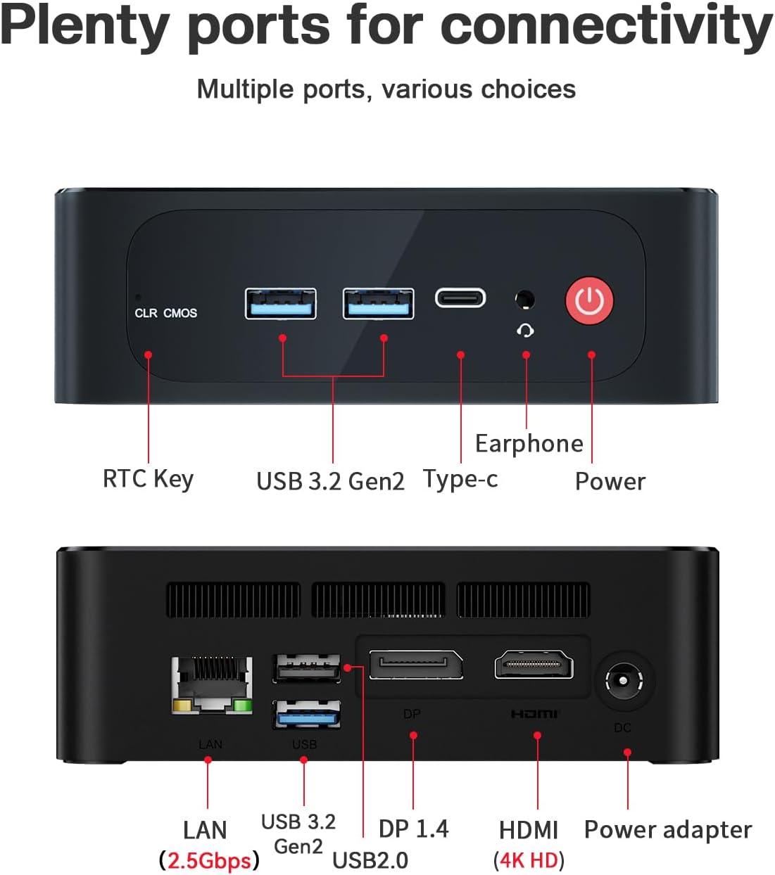 Multiple Interfaces & WirelessMini Desktop PC equipped with a 2.5G LAN (RJ-45 supporting Gigabit file transfer speeds) Dual-band 2.4G 5G WiFi (802.11ac stronger capacity of resisting disturbance) and built-in Bluetooth high-speed wireless connection makes you step ahead. And 3*USB3.2 ports 1*USB2.0 ports 1*HDMI ports 1*Type-C port(Data&Video) and 1*Audio Jack (HP&MIC) 1*DC Jack thus offering the user even greater versatility in use.