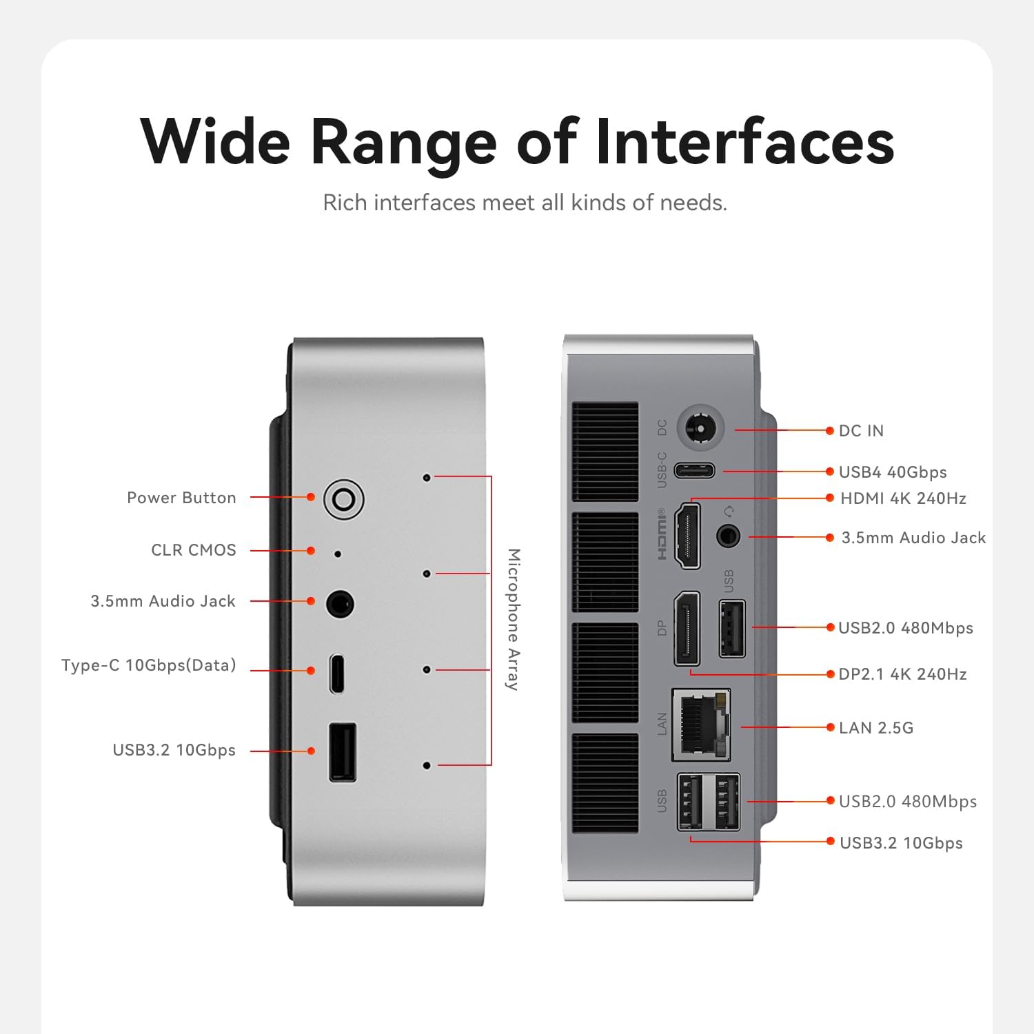 Rich Interfaces & WirelessThe Mini PC is designed with 1*HDMI(Max 4K 120Hz) 1*DP 1*USB-C(USB4 40G/PD/DP1.4) 1*USB-C(10Gbps) 1*RJ45 2500M LAN 2*USB3.2 2*USB2.0 2*Audio Jack (HP&MIC) and 1*DC Jack easily meet office business home audio and video needs. The Mini Computer built-in Wifi 6 802.11ax 2.4G+5G Dual Band and BT5.2 which can connect faster Speed and Farther Coverage ensure stable data transfers.