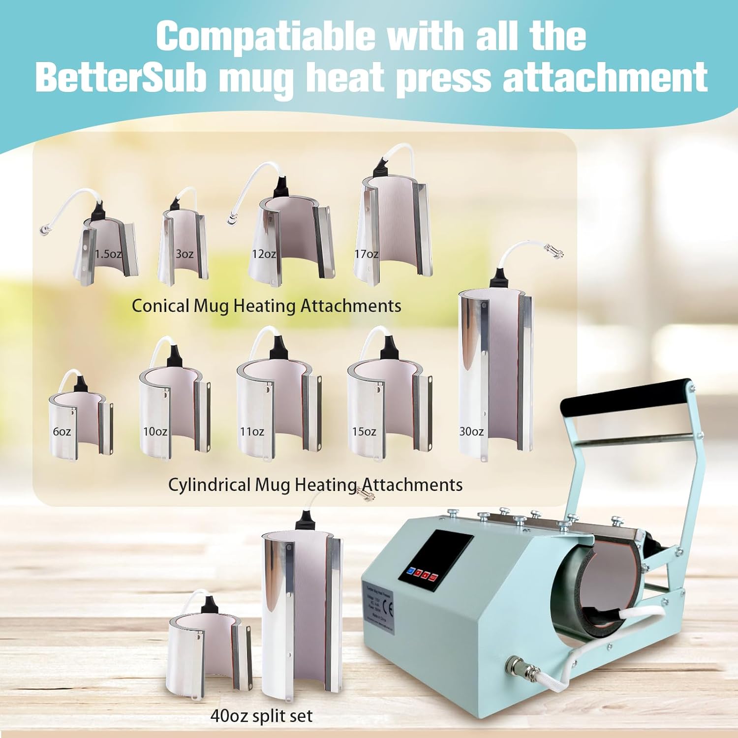 Wide Application This tumbler heat press machine is suitable for heat transfer skinny tumblers ceramic mugs glass cups metal cups glass beer mugs aluminum bottles shot glass cup etc. Its compatible with other sizes of mug heat press attachments of like 1.5oz 3oz 6oz 10oz 11oz 12oz 15oz 17oz 30oz.